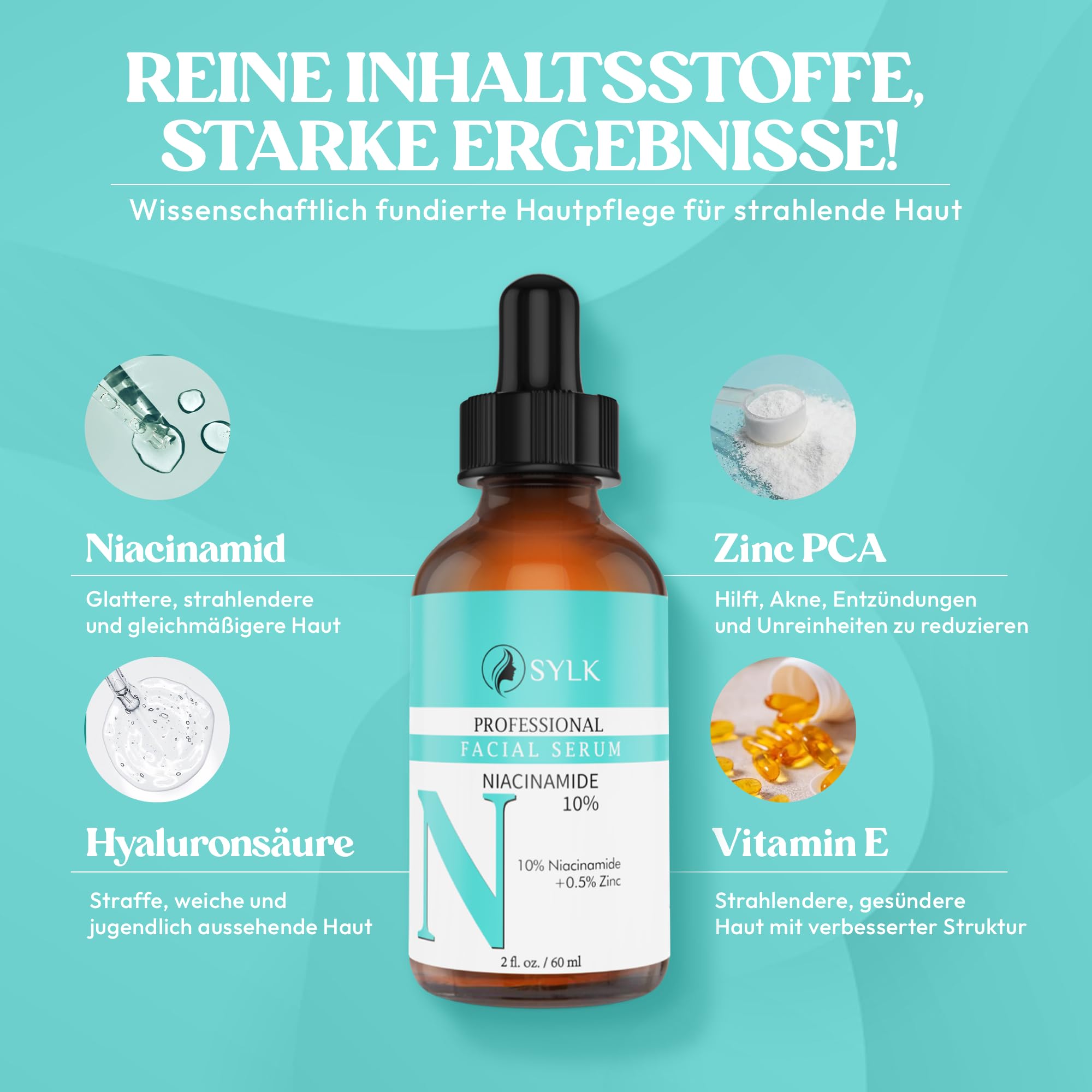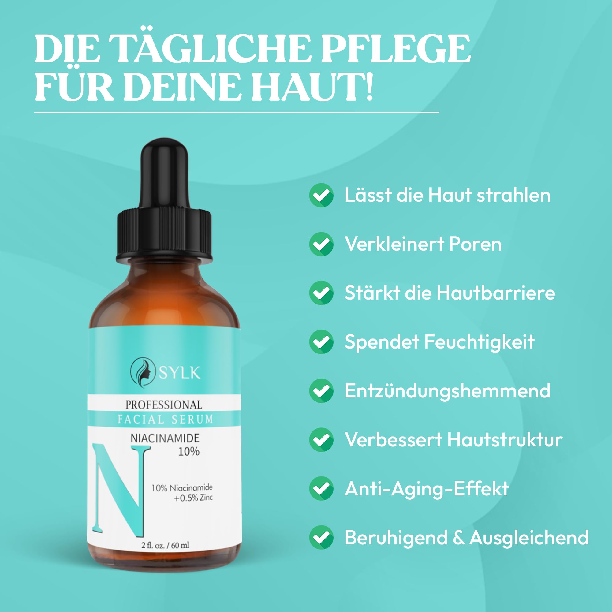 Niacinamid hilft, Pigmentflecken, Pickelmale und Rötungen sichtbar zu reduzieren und staerkt die Hautbarriere. Zink wirkt klaerend und ausgleichend, waehrend Hyaluron intensive Feuchtigkeit spendet und die Haut praller erscheinen laesst. Peptide unterstuetzen die Hautregeneration und tragen zu einem glatteren Hautbild bei.
