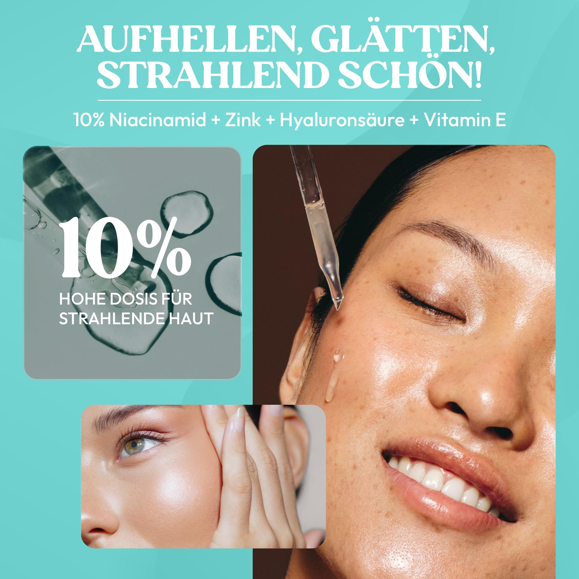 HOCHWIRKSAME 10 % NIACINAMID-FORMEL: Mit Niacinamid, Zink, veganer Hyaluronsaeure und Vitamin E zur Reduktion von Melanin, Verfeinerung der Poren und Wiederherstellung der natuerlichen Hautausstrahlung.
