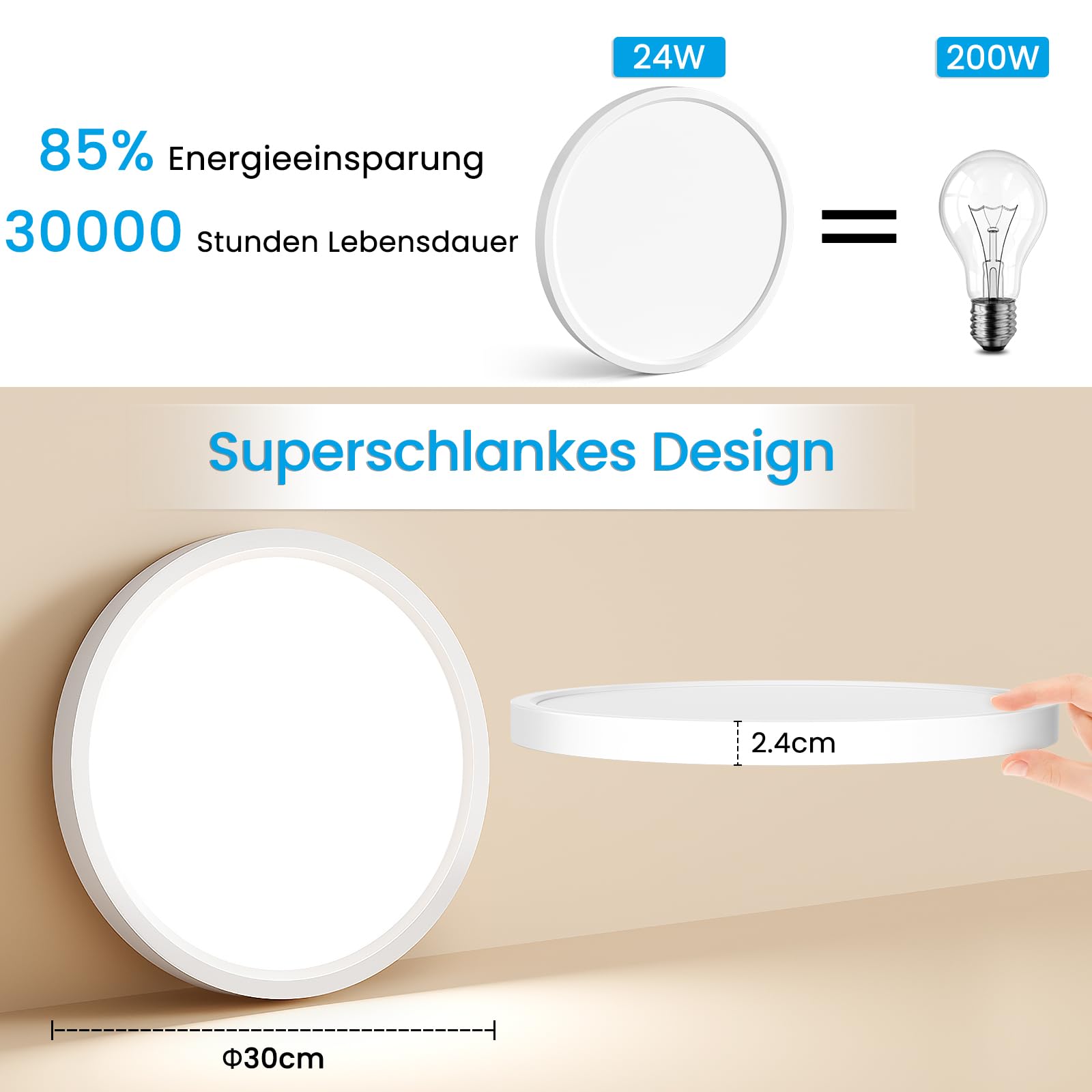 - Superhell und Energiesparend: Die Deckenlampe bietet eine energiesparende Lichtleistung von 24W und einen Lichtstrom von 2400LM mit neutralem Licht von 4000K, das Ihr Zimmer optimal ausleuchtet. Durch einen strengen Herstellungsprozess wird eine Lebensdauer von 30.000 Stunden gewährleistet, wodurch häufige Austausche entfallen. Der Ersatz einer 200W Glühbirne durch diese Lampe kann den Energieverbrauch um bis zu 85% senken und Ihre Stromrechnung verringern.