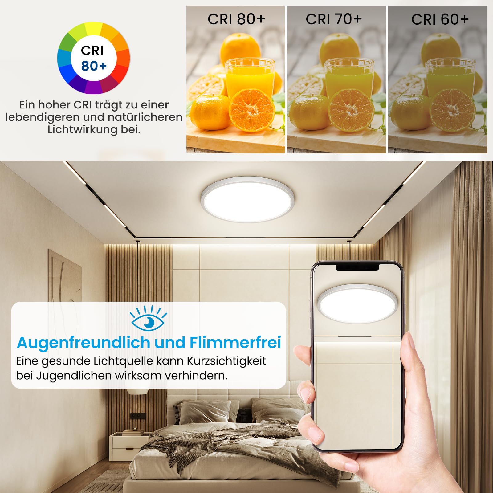 - Augenschutz und Flimmerfrei: Diese verbesserte Deckenlampe verfügt über einen hohen Farbwiedergabeindex von CRI 80+. Das lebendige und natürliche Licht ermöglicht es, die echten und originalen Farben von Objekten zu sehen, was augenfreundlicher ist. Der Lampenschirm zeichnet sich durch hohe Lichtdurchlässigkeit aus, wodurch das Licht gleichmässig und weich ist, ohne Blendung oder Flimmern, und bietet einen guten Augenschutz.