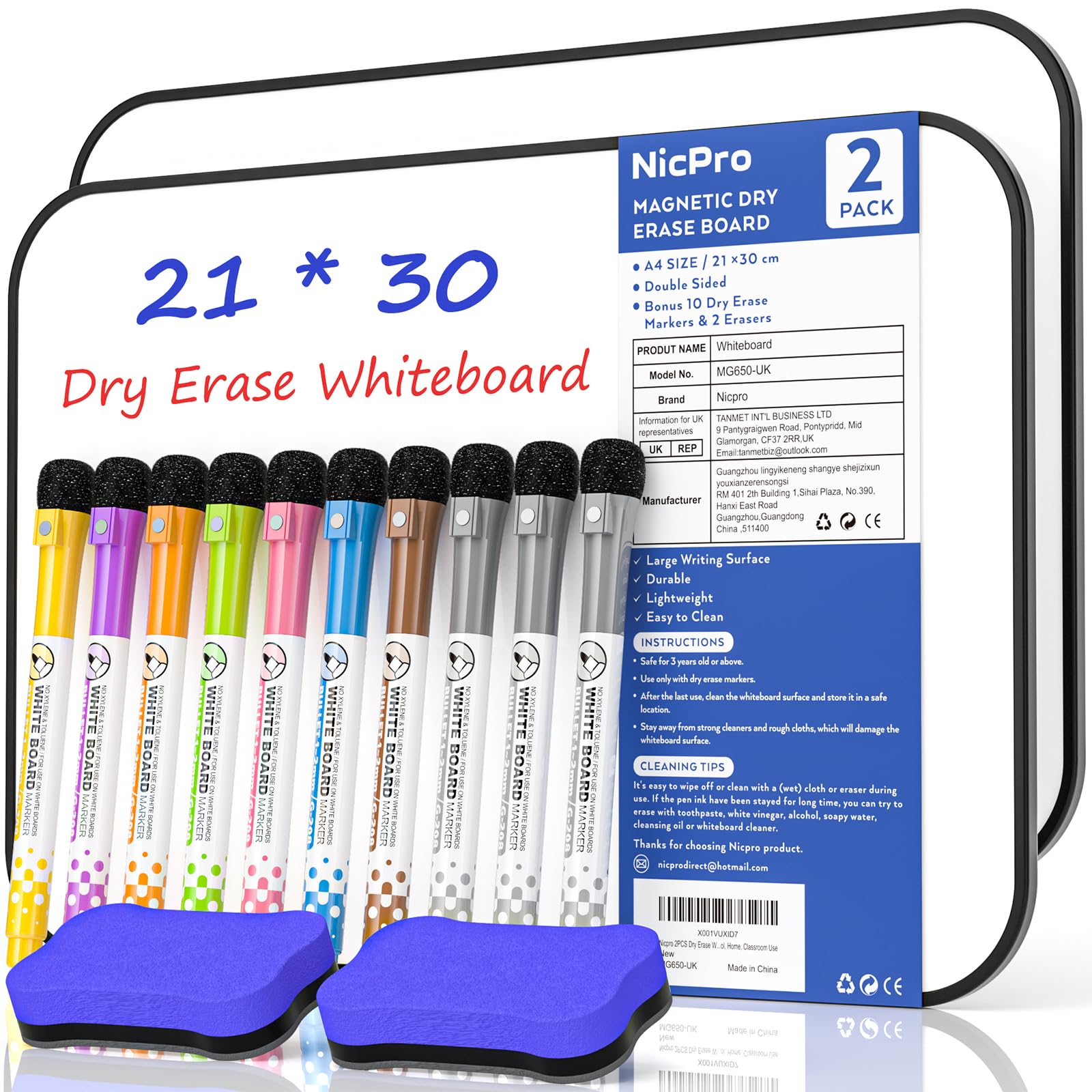 Nicpro 2 Stück trocken abwischbares Whiteboards A4, doppelseitig Whiteboard Klein, 21 x 30 cm Whiteboard Magnetisch, inklusive 10 wasserbasierten Stiften und 2 Radiergummis für Schreiben und Zeichnen