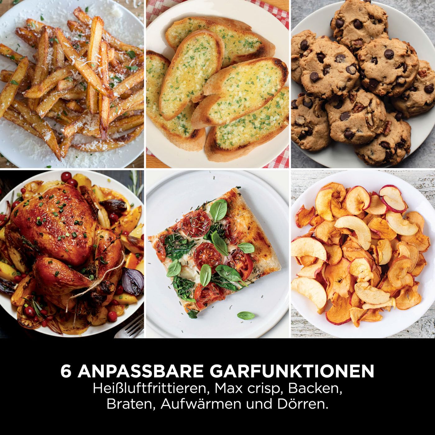 Mit 2 gestapelten Schubladen ist die platzsparende Ninja Double Stack XL 2-Schubladen-Heissluftfritteuse 30 % schlanker*, ohne dabei an Kapazität zu verlieren - perfekt für kleinere Küchen, grosse Familien und Unterhaltung. In jede 4,75-l-Schublade passt ein ganzes 1,4-kg-Brathähnchen oder nutzen Sie die mitgelieferten Drahtgestelle für die doppelte Kapazität**, um gleichzeitig 4 Speisen zuzubereiten. Ideal für die Verpflegung von 8 Personen. Kombinieren Sie aus 6 Kochfunktionen: Heissluft-Frittieren, Max Crisp, Braten, Backen, Dörren und Aufwärmen. Verwenden Sie in jeder Schublade eine andere Funktion, Zeit und Temperatur - beide gleichzeitig fertig mit der SYNC-Funktion. Kochen Sie bis zu 55 % schneller als Umluftöfen*** und verwenden Sie dabei bis zu 55 % weniger Energie****. Diese Doppel-Heissluftfritteuse ist einfach zu bedienen, mit einem im Lieferumfang enthaltenen Rezeptführer, und einfach zu reinigen mit Antihaft- und spülmaschinenfesten Schubladen und Knusperblechen. Machen Sie Ihre Küche zu einer Ninja-Küche. im Vergleich zu AF400. ** bei Verwendung der herausnehmbaren Gestelle. *** getestet an Fischstäbchen und Würstchen. *** Die Tests und Berechnungen basieren auf der empfohlenen Garzeit für Würstchen bei Verwendung der Heissluft-Frittier-Funktion im Vergleich zu herkömmlichen Öfen.