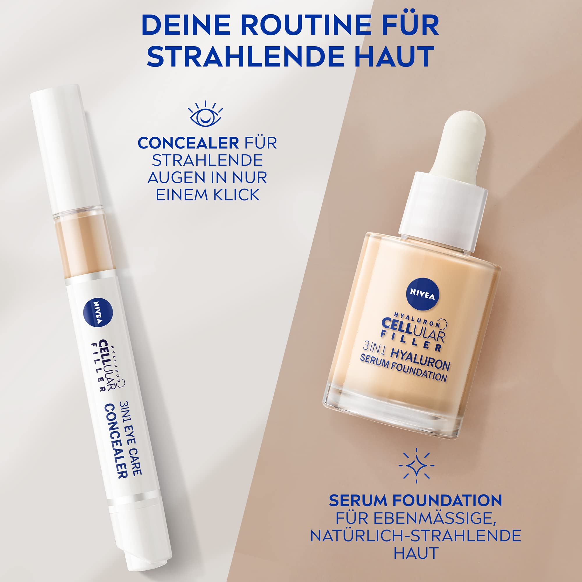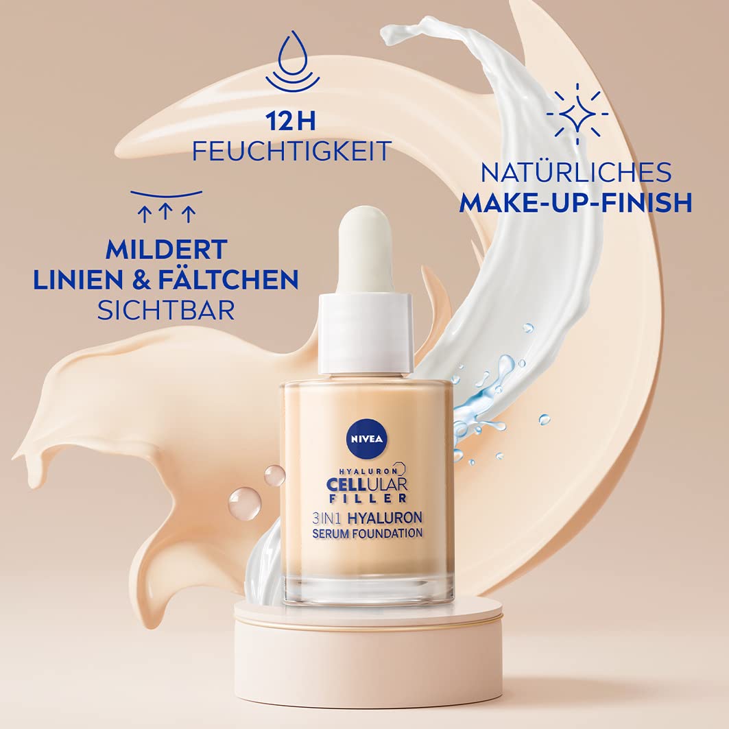 NIVEA 3in1 Hyaluron Serum Foundation hell (30 ml), Anti-Age Make-up für eine jünger aussehende Haut, feuchtigkeitsspendend und verleiht einen natürlich-ebenmässigen Teint
