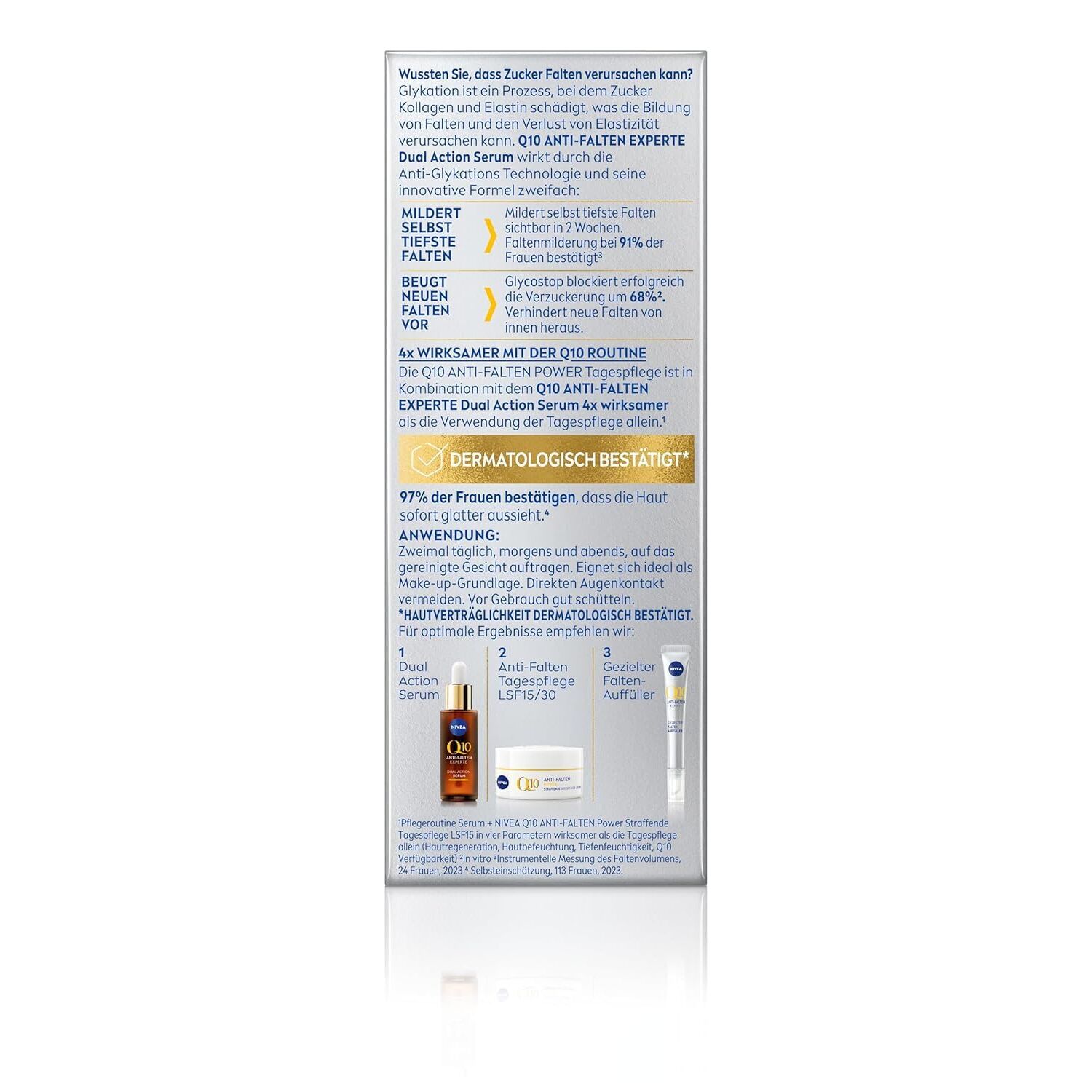 Ein effektives Anti-Age Serum von Nivea, das gezielt entwickelt wurde, um feine Linien und Falten zu reduzieren, die Haut zu straffen und den Alterungsprozess der Haut zu unterstützen. Die Kombination aus Q10, einem starken Antioxidans, und GlycoStop, einem Anti-Falten-Wirkstoff, hilft, die Hautstruktur sichtbar zu verbessern und für ein glatteres, vitaleres Hautbild zu sorgen.
