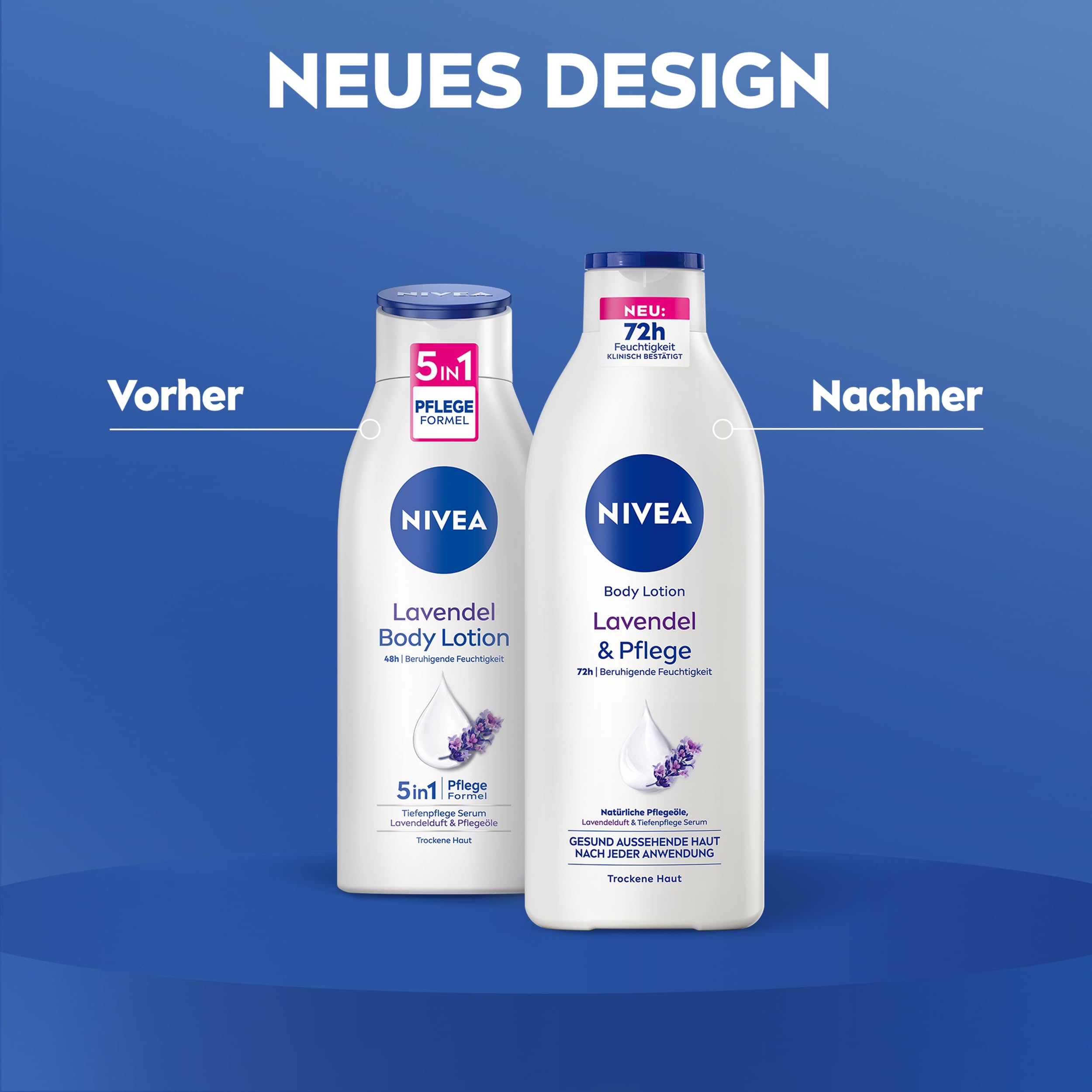 Die NIVEA Lavendel & Pflege Body Lotion ist die perfekte Wahl für alle, die trockene Haut intensiv pflegen und gleichzeitig ein entspannendes Pflegeerlebnis geniessen möchten. Für eine Haut, die sich weich, geschmeidig und gesund anfühlt – sichtbar gepflegt nach jeder Anwendung.
