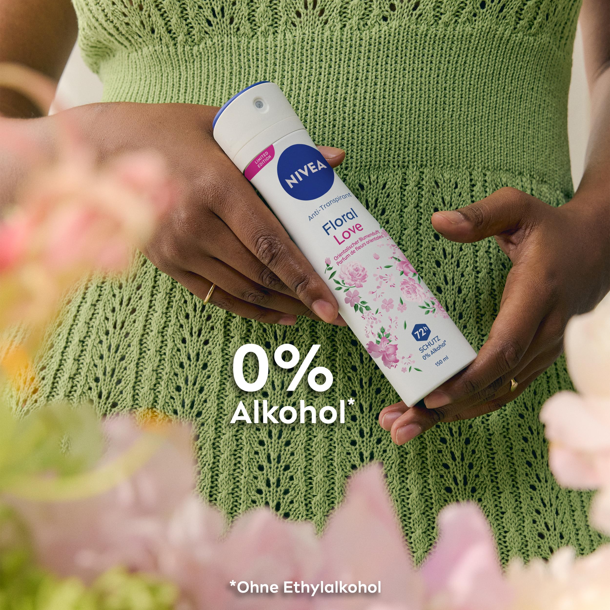 Das NIVEA Deo Spray Floral Love bietet langanhaltende Frische und zuverlaessigen Anti-Transpirant Schutz fuer bis zu 72 Stunden. Die Duftkomposition aus orientalischen Blueten sorgt fuer ein feminines, warmes Dufterlebnis, das im Alltag gepflegt wirkt. Das Anti-Transpirant mit 0% Alkohol (ohne Ethylalkohol) kombiniert starke Wirkung mit sanfter Pflege fuer weiche, glatte und schoene Achseln. Die Hautvertraeglichkeit ist dermatologisch bestaetigt.