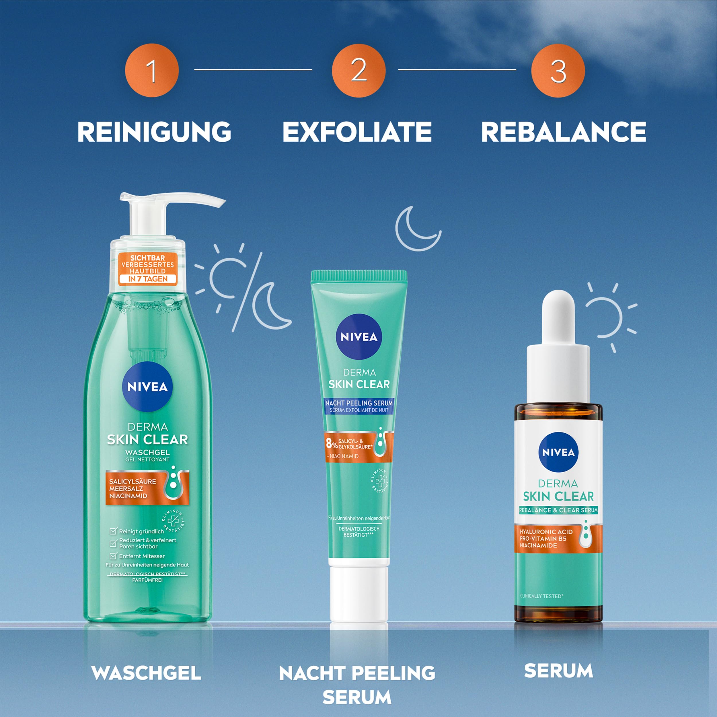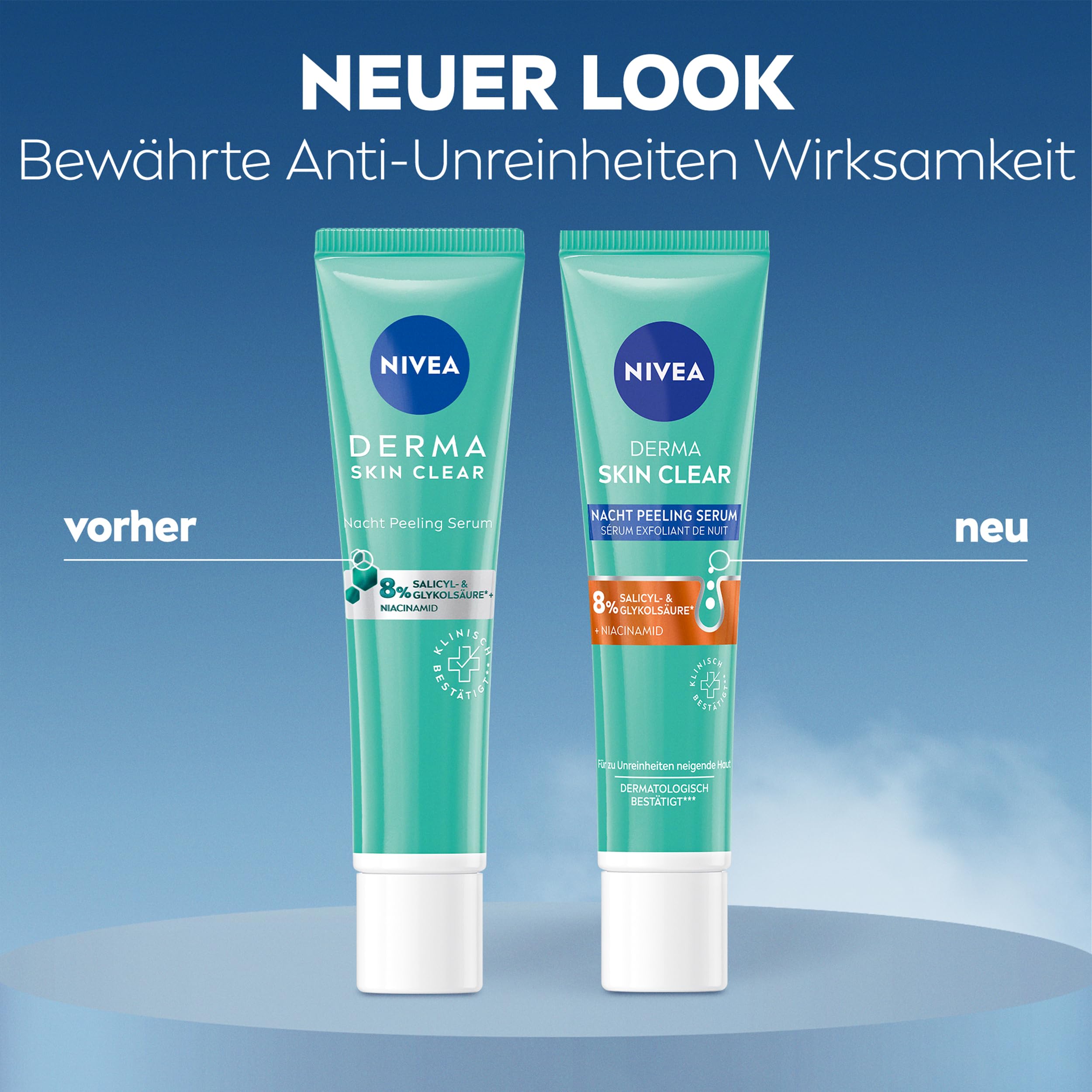 NIVEA Derma Skin Clear Nacht Peeling Serum – sichtbar verbessertes Hautbild in nur 7 TagenDas NIVEA Derma Skin Clear Nacht Peeling Serum wurde speziell für zu Unreinheiten neigende Haut entwickelt. Das Peeling Serum enthält eine hochkonzentrierte Formulierung mit 8% Salicyl- und Glykolsäure* sowie Niacinamid. Es unterstützt den natürlichen Erneuerungsprozess der Haut, verfeinert die Poren und pflegt die Haut. Ausserdem reduziert das Nacht Peeling Serum Hautunreinheiten und beugt ihrer Neuentstehung vor. Für ein sichtbar verbessertes Hautbild in 7 Tagen: NIVEA Derma Skin Clear Nacht Peeling Serum.Das BHA Peeling ist Teil der Derma Skin Clear Serie und kann zusammen mit der gesamten NIVEA Serie für jeden Schritt der Hautpflege-Routine verwendet werden. Die Pflege für unreine Haut ist klinisch getestet* sowie dermatologisch bestätigt**.Anwendung:Abends auf das gut gereinigte Gesicht auftragen. Nicht abspülen. Nicht über 25°C lagern.Warnhinweis: Es kann ein leichtes Brennen auftreten. Nicht auf gereizter Haut anwenden. Bei Auftreten einer Reizung die Anwendung abbrechen. Bei anhaltender Reizung einen Arzt aufsuchen. Kontakt mit den Augen vermeiden.Derma Skin Clear Routine:Morgens: 1. Waschgel, 2. Refining Toner, 3. Rebalance & Clear SerumAbends: 1. Waschgel, 2. Refining Toner, 3. Nacht Peeling SerumHaut & Umwelt: Aus Liebe zu Haut und Umwelt ist die Formel der Nachtpflege vegan, enthält also keine Inhaltsstoffe tierischen Ursprungs.*1% Salicylsäure + 7% Glykolsäure**Wirksamkeit bei zu Unreinheiten neigender Haut in klinischen Studien getestet.***Hautverträglichkeit dermatologisch bestätigt.
