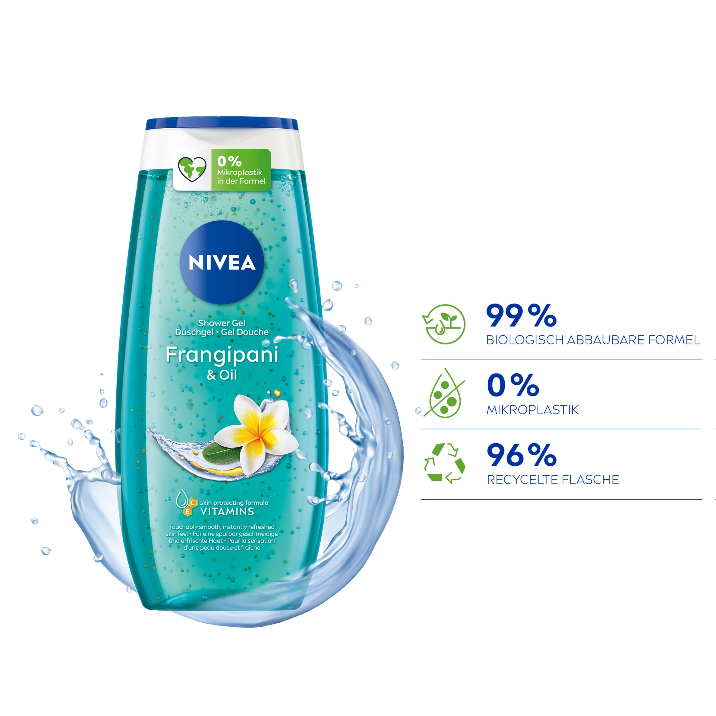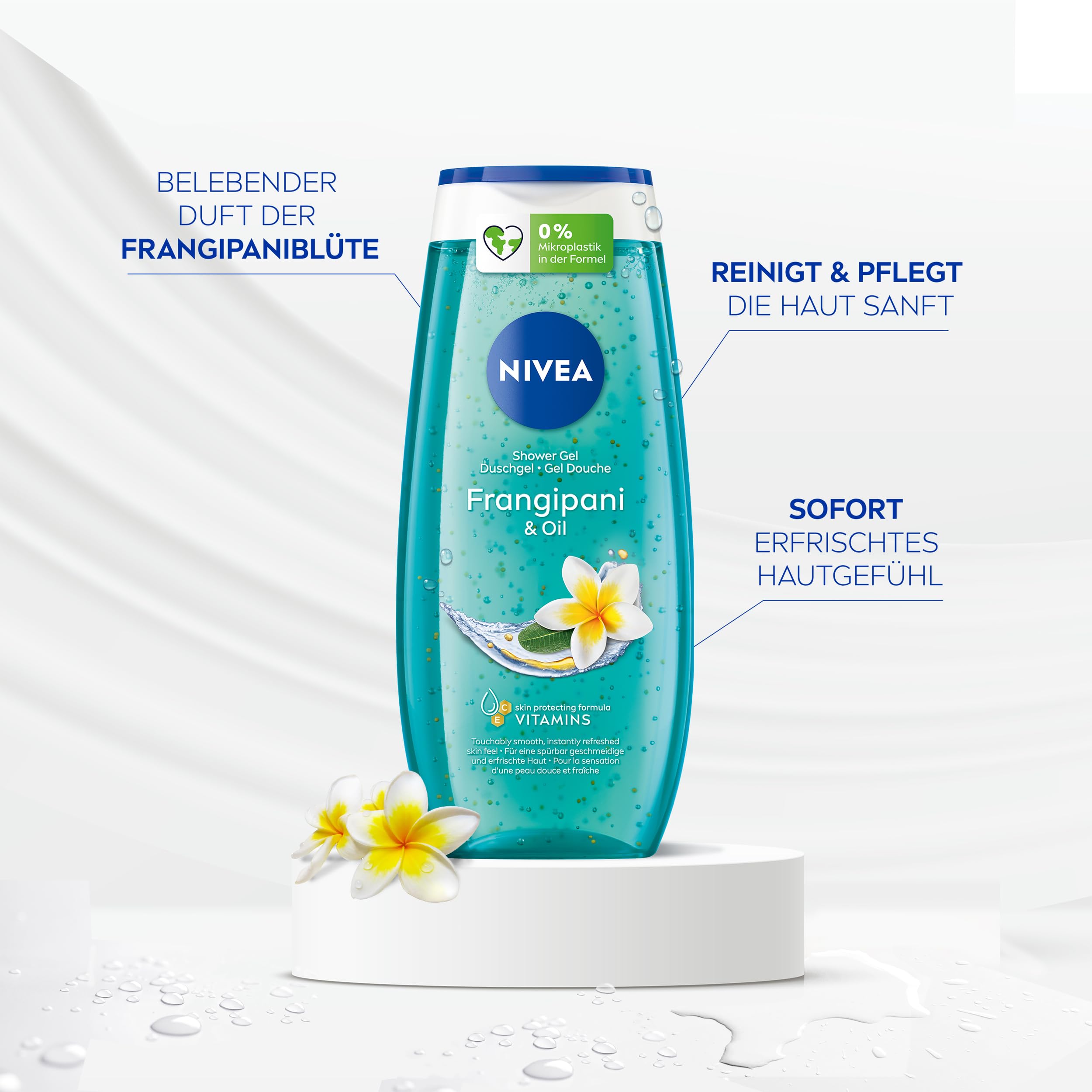 • NIVEA Frangipani & Oil Duschgel mit pflegenden Ölperlen und dem belebenden Duft der Frangipaniblüte reinigt die Haut sanft und spendet Erfrischung.