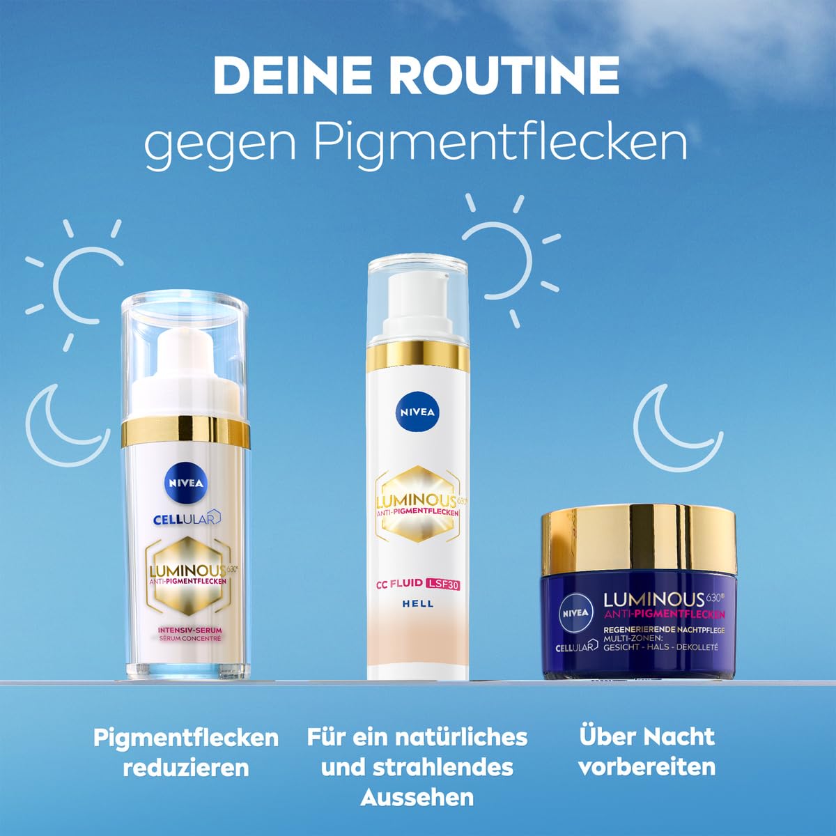 NIVEA Luminous 630® Anti-Pigmentflecken CC Fluid – für eine ebenmässige & strahlende Haut mit makellosem TeintDas LUMINOUS 630® Anti-Pigmentflecken CC Fluid mit LSF 30 sorgt für strahlende Haut und perfektioniert den Teint dank 3-in-1-Wirkung:1. Kaschiert: Mikroverkapselte Farbpigmente in der Feuchtigkeitscreme, die sich dem Hautton anpassen, verleihen einen natürlichen, ebenmässigen Teint und gleichen Pigmentflecken und Unebenmässigkeiten sofort aus.2. Reduziert: Die leichte, seidige Formel der Gesichtscreme mit LUMINOUS630® reduziert Pigmentflecken sichtbar in 2 Wochen und gleicht den Teint in 8 Wochen um + 40% aus.*3. Schützt: Die Formel der NIVEA Creme mit LSF30 schützt vor UV-Strahlen und beugt der Neuentstehung von Pigmentflecken vor.Mit zellaktivierender** Hyaluronsäure versorgt die Gesichtscreme die Haut zudem mit Feuchtigkeit und polstert sie auf.Die Innovation nach 10 Jahren Forschung: Nach 10 Jahren intensiver Forschung hat NIVEA den hochwirksamen, patentierten Wirkstoff LUMINOUS 630® entwickelt, um Pigmentflecken zu reduzieren und deren Neuentstehung vorzubeugen.Anwendung:Täglich morgens auf das gereinigte Gesicht auftragen. Für ideale Ergebnisse das LUMINOUS 630 ® Intensiv-Serum vor dem Fluid verwenden.LUMINOUS 630 ® Gesichtspflege-Produkte nicht mehr als 4x am Tag verwenden. Direkten Augenkontakt vermeiden.*Selbsteinstufung, 12-wöchige Studie mit 51 Frauen, 2023**an Hautzellen getestet