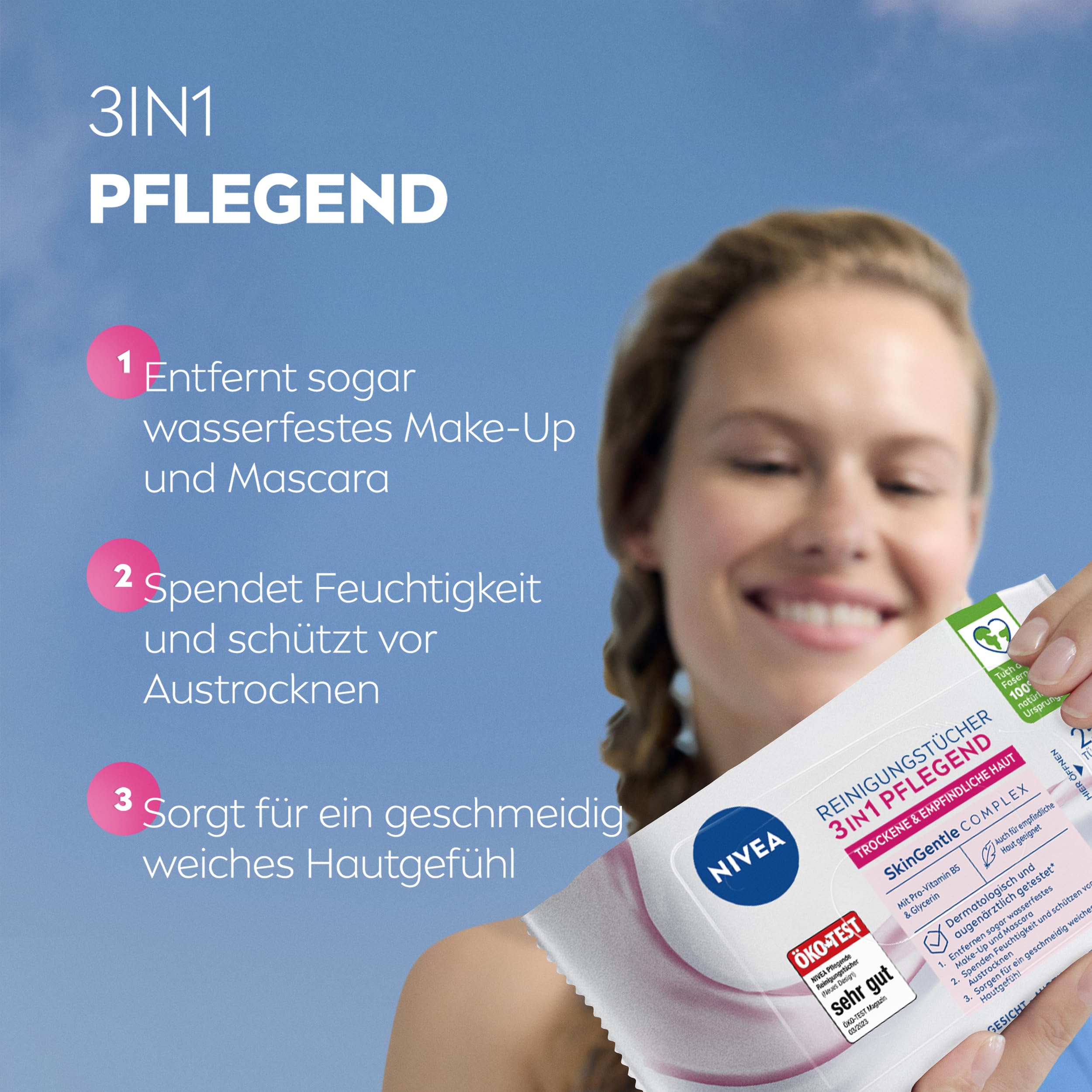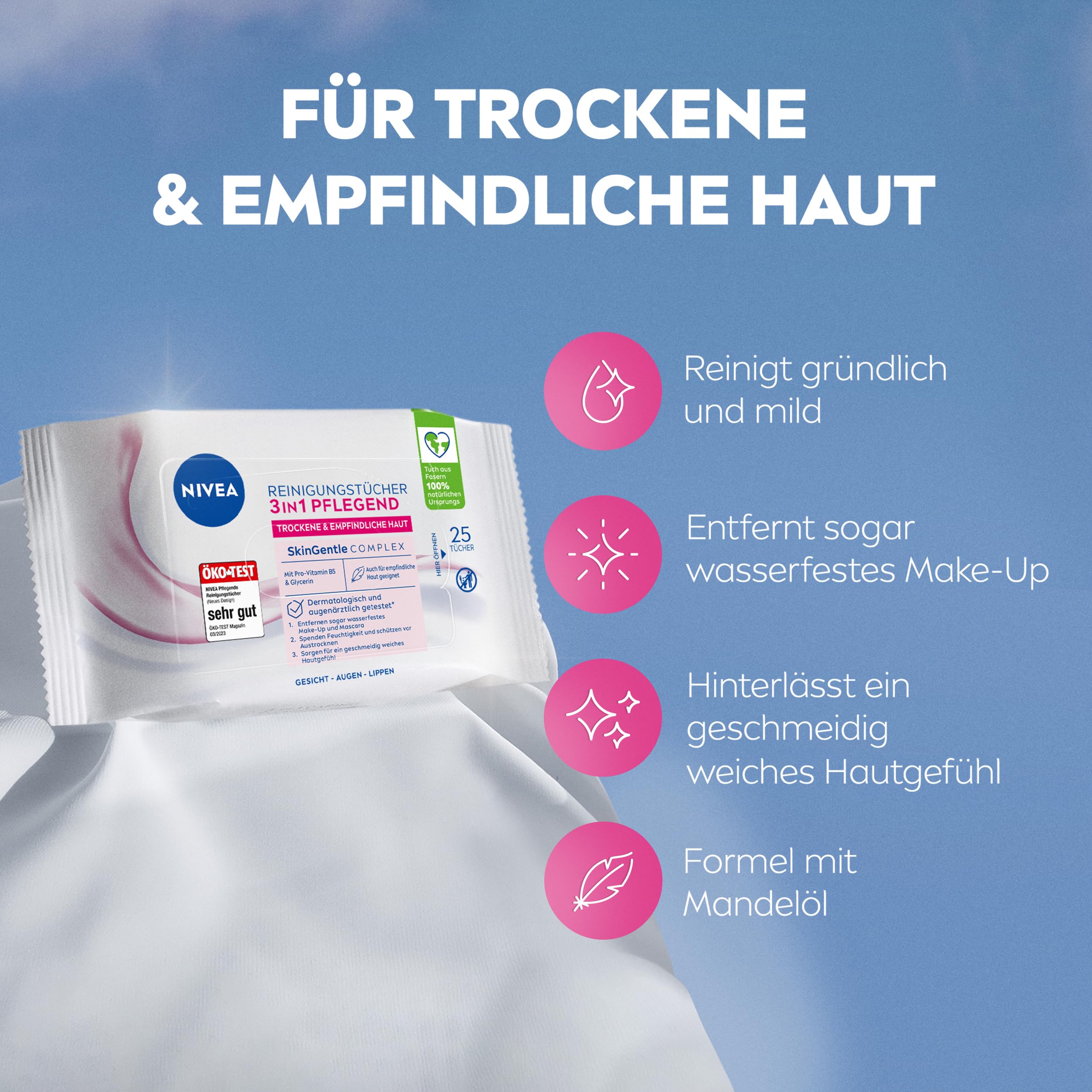 NIVEA Reinigungstücher 3in1 Pflegend, Abschminktücher mit Glycerin und Mandelöl für wasserfestes Make-Up, sanfte Gesichtsreinigung für trockene & empfindliche Haut (25 Stück)