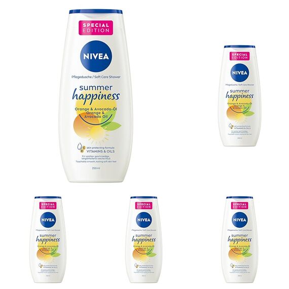 NIVEA Summer Happiness Orange Pflegedusche 250 ml (Packung mit 5) – Feuchtigkeitsspendendes Duschgel mit Avocado-Öl und frischem Orangen-Duft