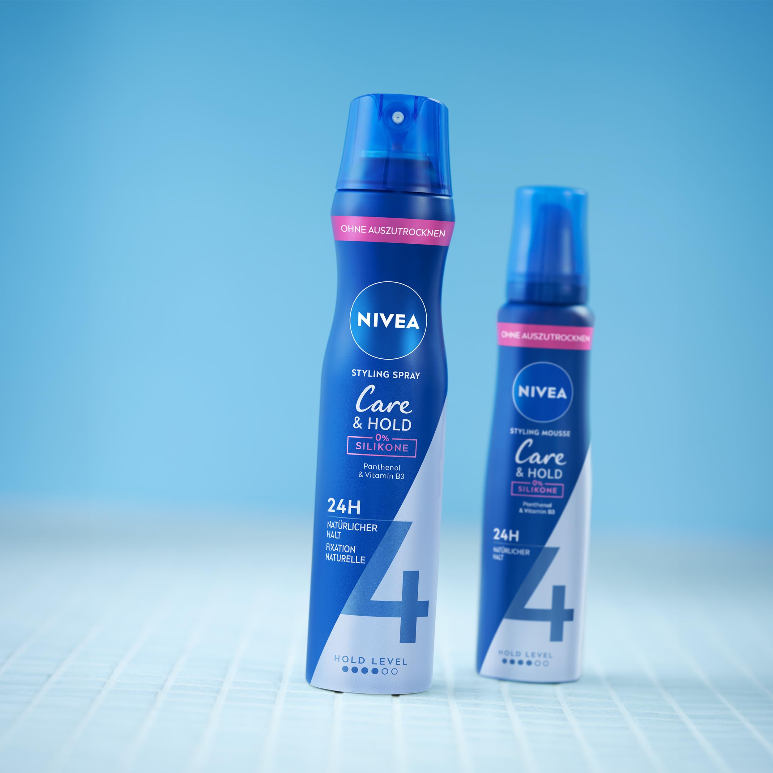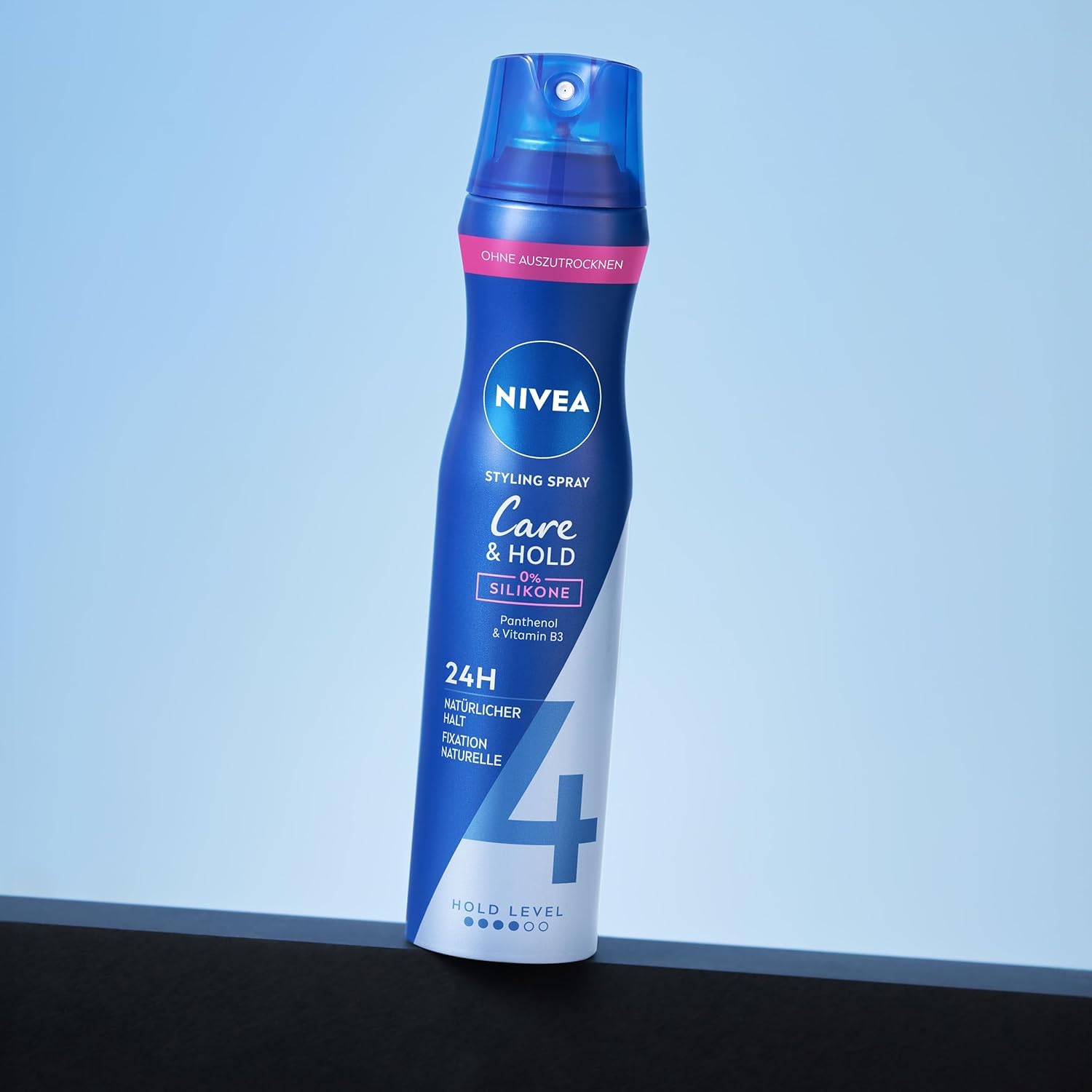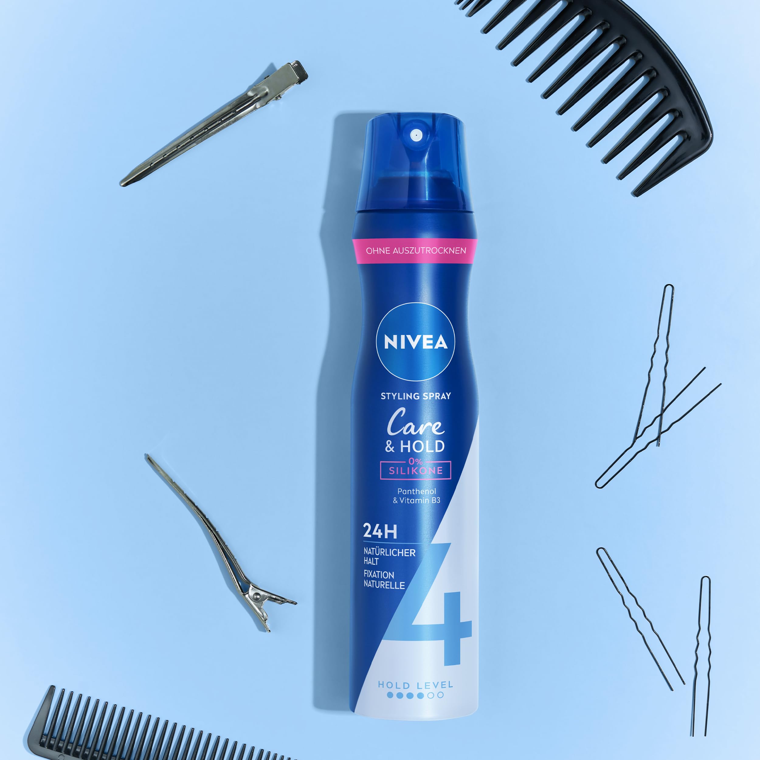 NIVEA Care & Hold Styling Spray, stärkendes Haarspray mit Panthenol & Vitamin B3, Haarlack für flexible Stylings mit 24h Halt (Haltestufe 4), veganes Pflegespray (250 ml)