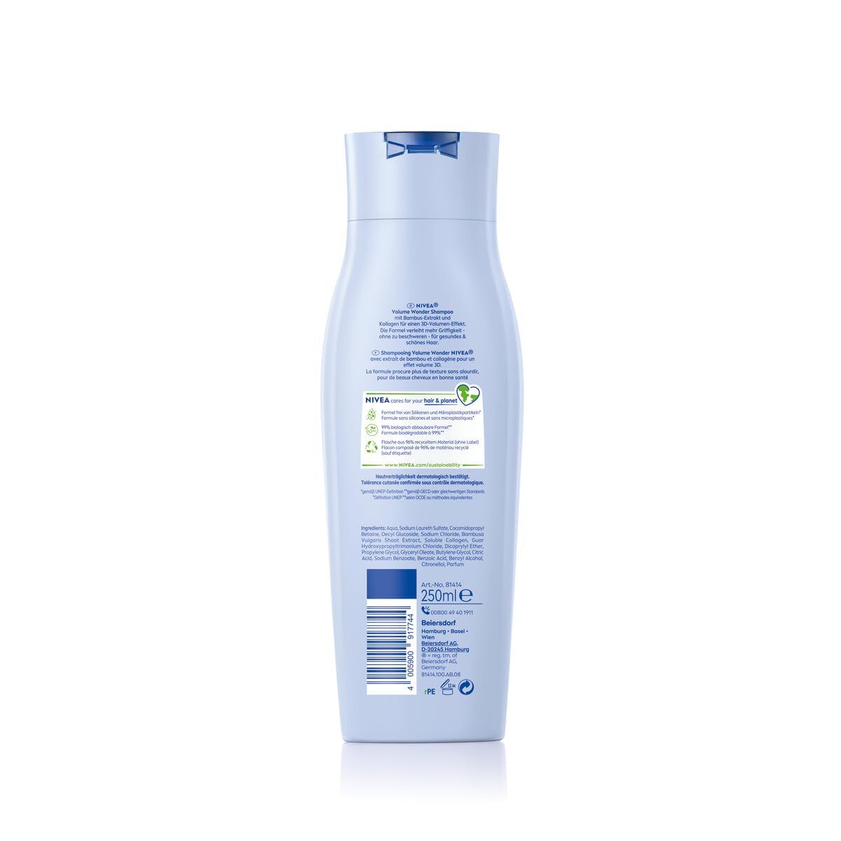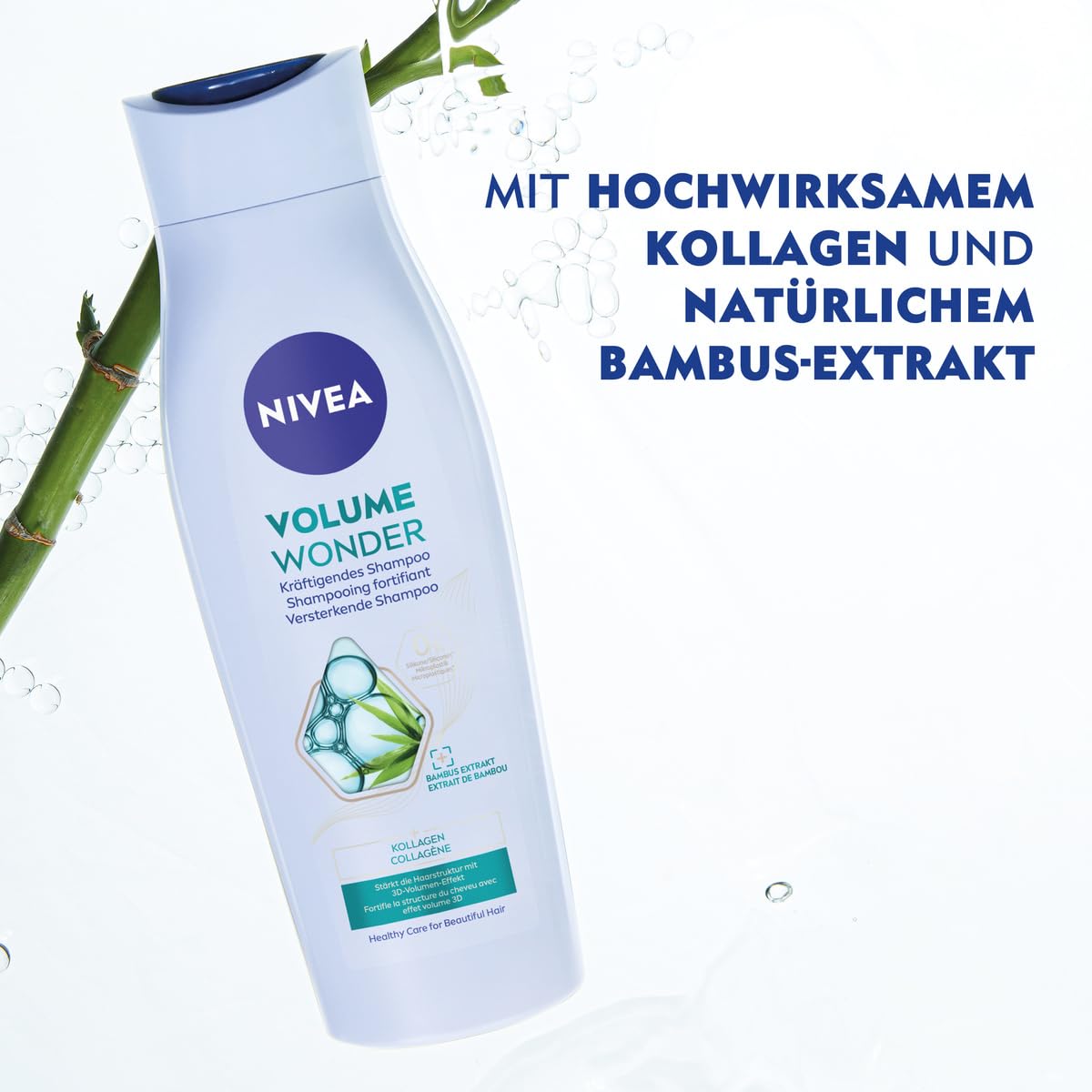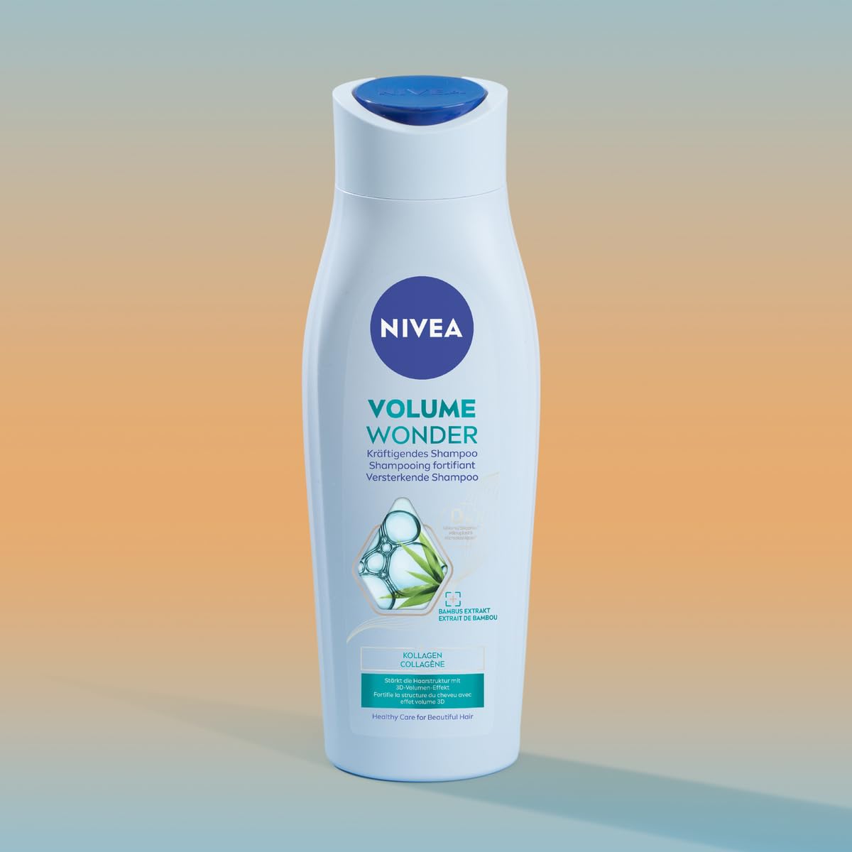 NIVEA Volume Wonder Kräftigendes Shampoo – für sofortigen 3D-Volume Effekt und verbesserte KämmbarkeitDas NIVEA Volume Wonder Kräftigendes Shampoo sorgt für sofortigen 3D-Volume Effekt. Das kräftigende NIVEA Shampoo mit hochwirksamem Kollagen und natürlichem Bambus-Extrakt sorgt für gestärktes, kraftvolles und schönes Haar. Das Pflegeshampoo reinigt sanft die Kopfhaut und pflegt das Haar, ohne zu beschweren. Für eine optimale, gesunde Haarpflege und natürlich schönes Haar: Volume Wonder Kräftigendes Shampoo von NIVEA.Die Hautverträglichkeit des NIVEA Volume Wonder Kräftigendes Shampoo ist dermatologisch bestätigt.NIVEA kümmert sich um Ihre Haare und den Planeten:99 Prozent biologisch abbaubare Formel***Formel frei von Silikonen und Mikroplastikpartikeln*Flasche aus 96 Prozent recyceltem Material***Gemäss UNEP-Definition.**Ohne Label.***Gemäss OECD oder gleichwertigen Standards.