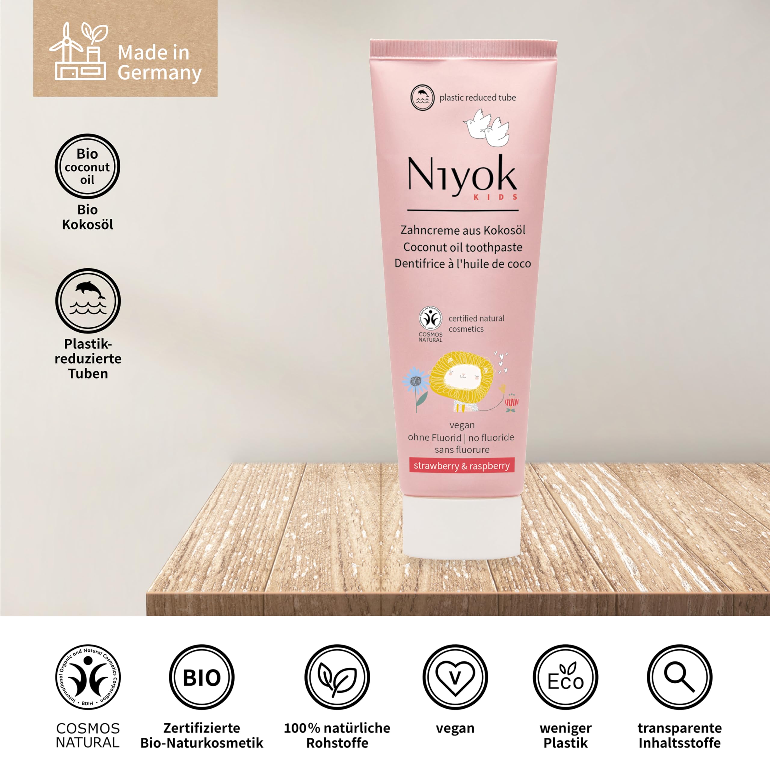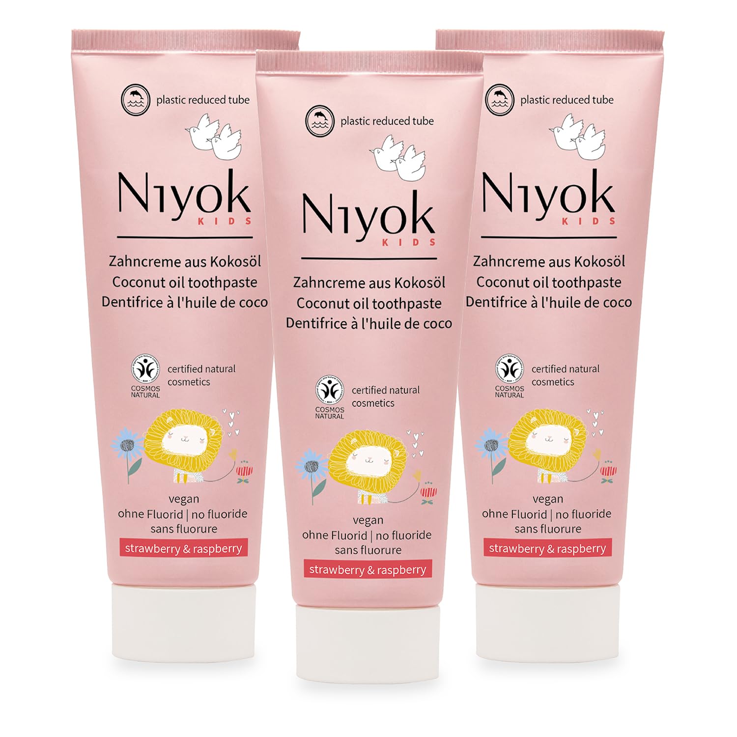 Niyok Bio Zahncreme für Kinder 75ml (3er Set) schützt Zähne & Zahnfleisch, Natürliche Kinder Zahnpasta ohne Fluorid, Vegane Kinderzahncreme, Mit fruchtigem Erdbeere & Himbeere Geschmack