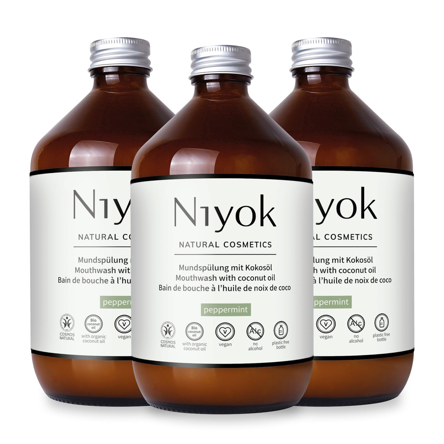 Niyok® Mundspülung mit Kokosöl "Pfefferminze" (3x500ml) • Antibakterielle Mundspülung Bio-Kokosöl • Ohne Fluorid & Ohne Alkohol • Für gesundes Zahnfleisch • Mundwasser gegen Mundgeruch