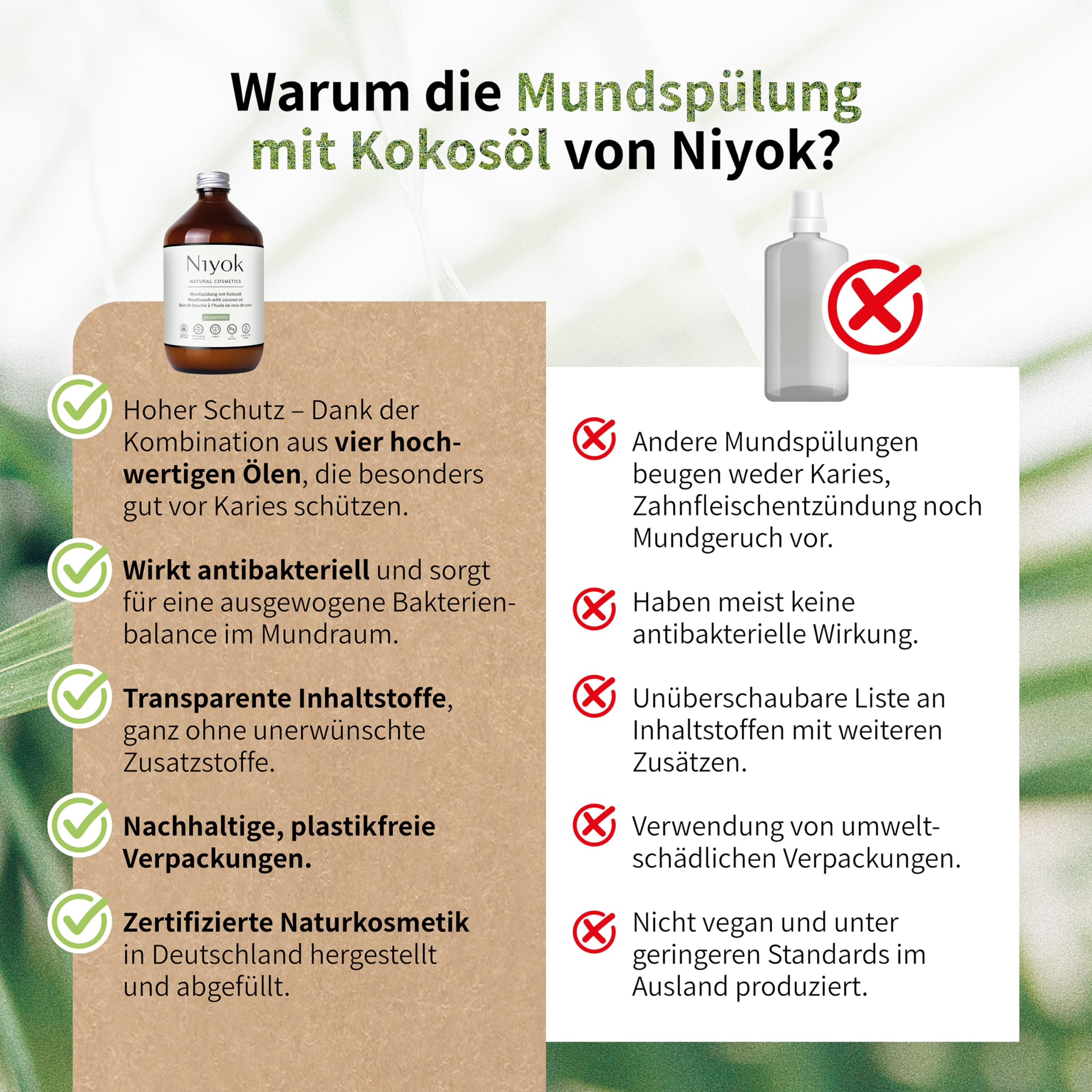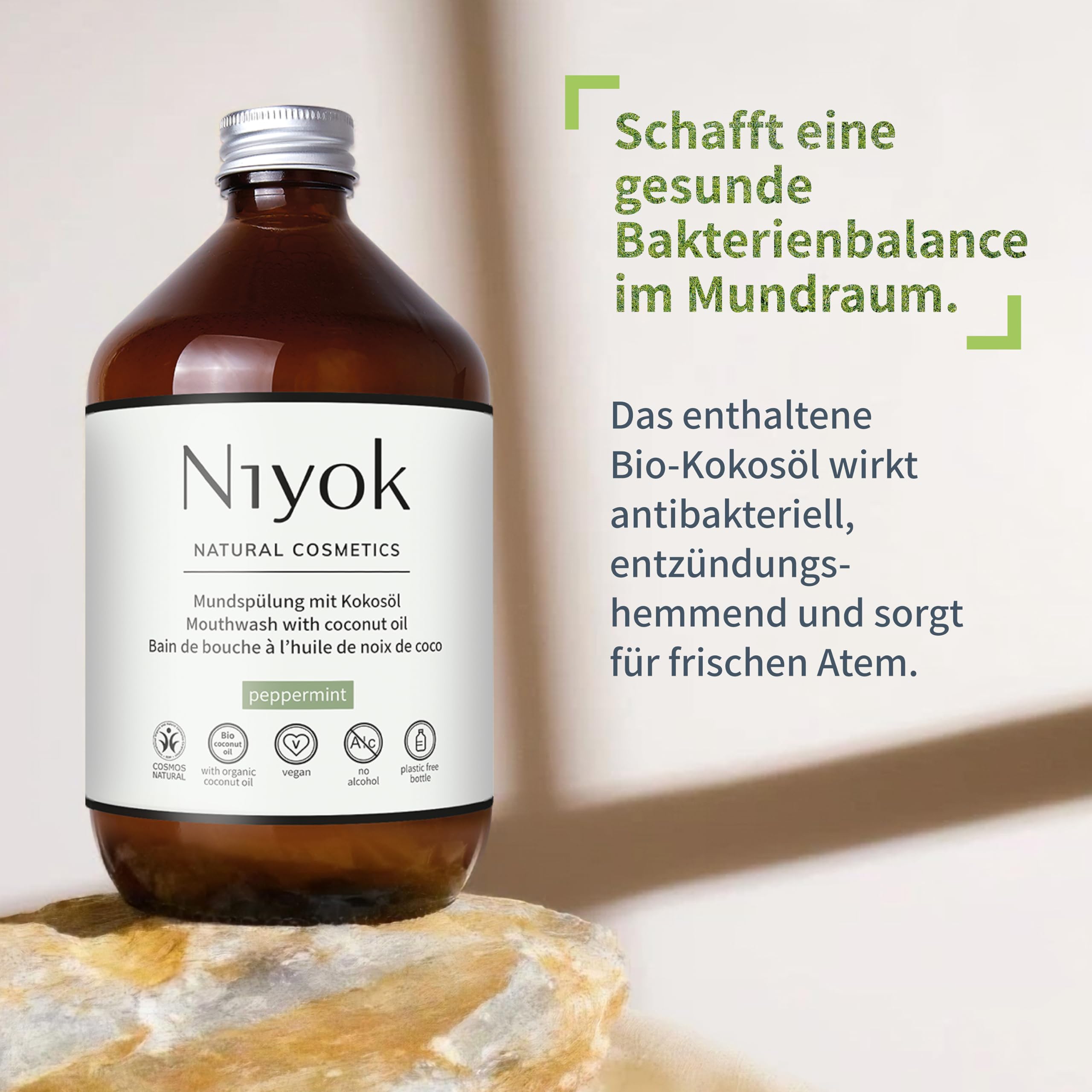 Niyok® Mundspülung mit Kokosöl "Pfefferminze" (500ml) • Antibakterielle Mundspülung Bio-Kokosöl • Ohne Fluorid & Ohne Alkohol • Für gesundes Zahnfleisch • Mundwasser gegen Mundgeruch