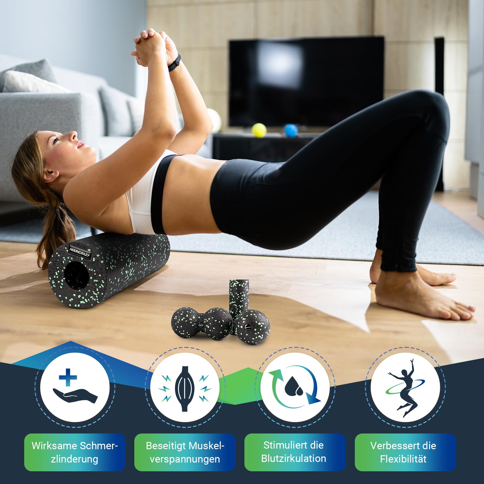 nooncrazy Faszienrolle Set mit Kordelzugbeutel und Training Posters, Faszien Set mit Faszienball Faszienrolle Klein und Duoball für Faszien Training von Muskeln, Bindegewebe und Stoffwechsel