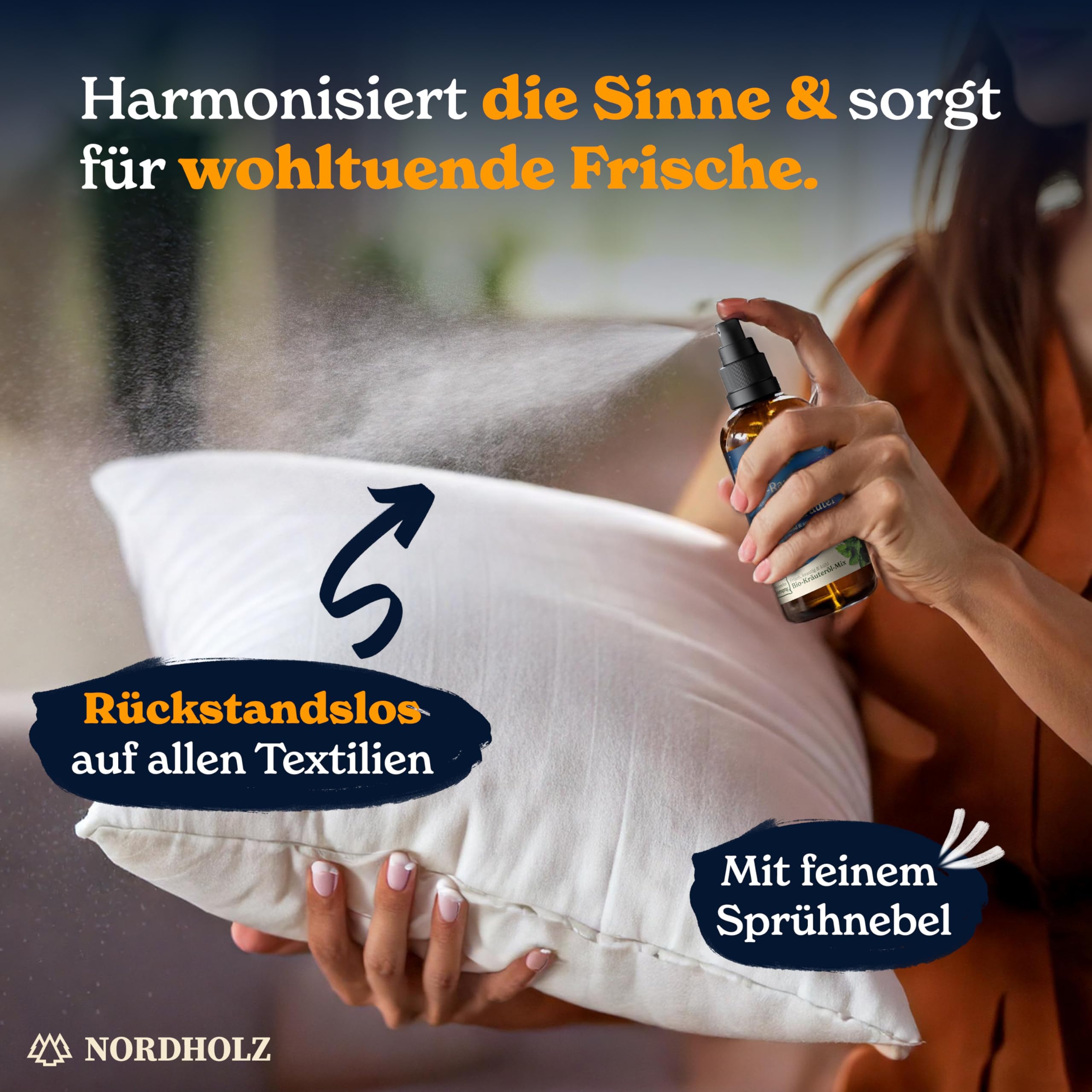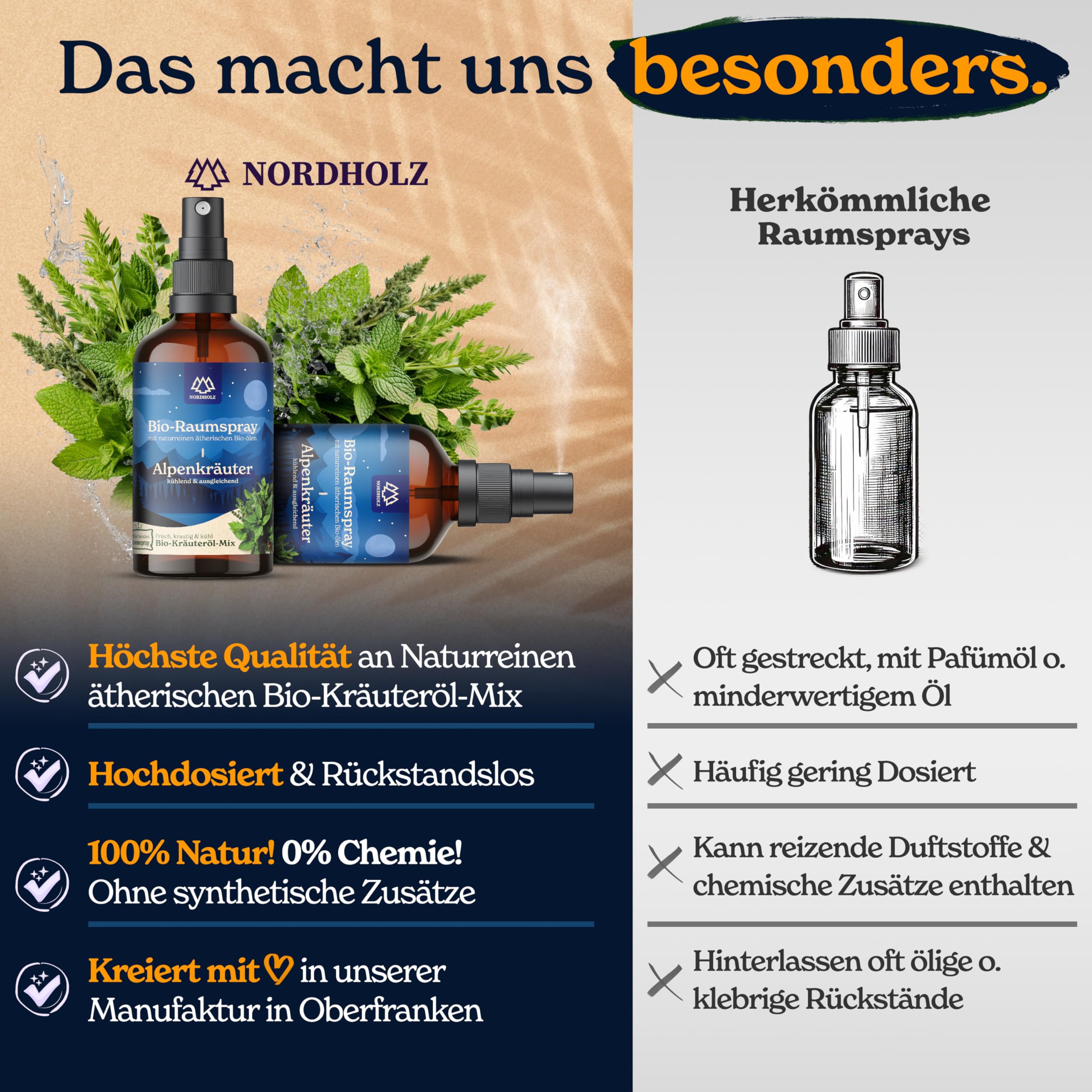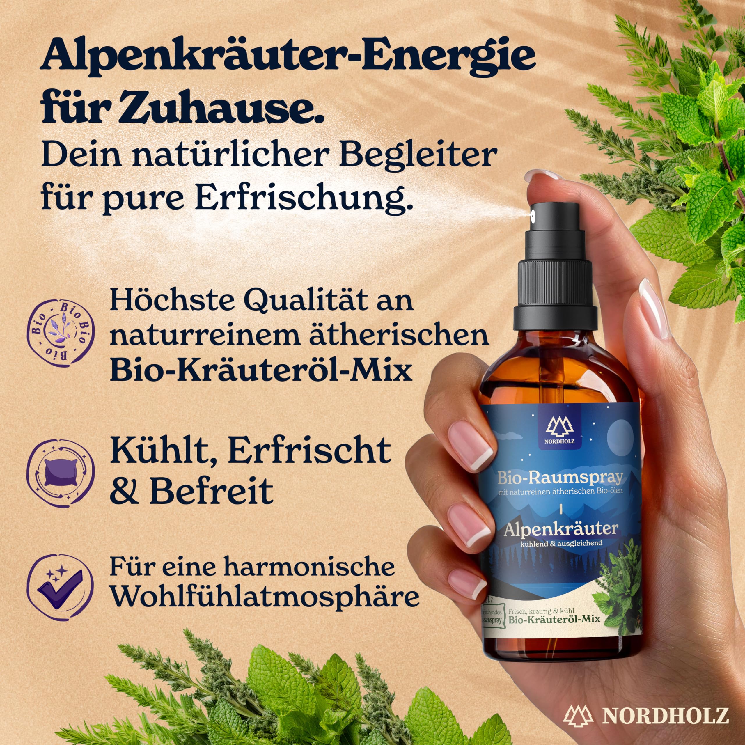 NORDHOLZ® Alpenkräuterspray – BIO-Raumspray Alpenkräuter – Natürlicher Raumduft für Kissen, Wohnräume & Schlafzimmer mit 100% naturreinem ätherischem BIO-Alpenkräuteröl – Kissenspray