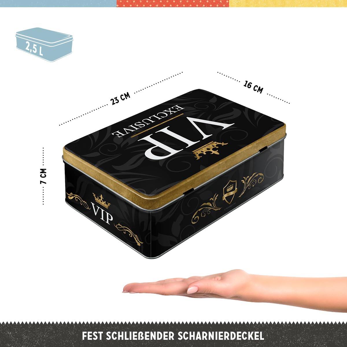 Nostalgic-Art Retro Vorratsdose Flach, 2,5 l, VIP Exclusive – Geschenk-Idee für besondere Menschen, Blech-Dose mit Deckel, Vintage Design