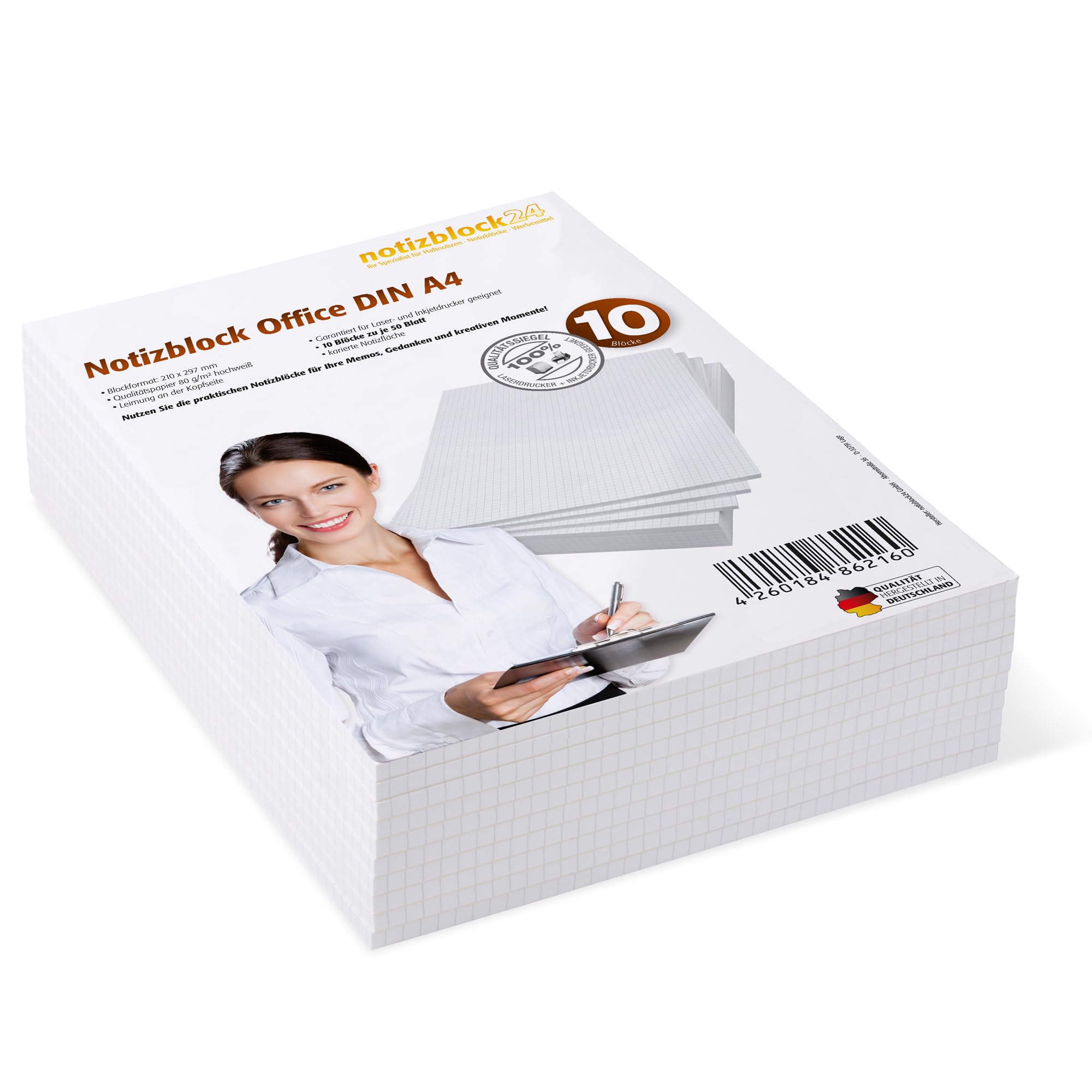 Notizblöcke DIN A4 kariert, 10er Pack, 50 Blatt je Block, 80 g/m² Offset weiss, notizblock24