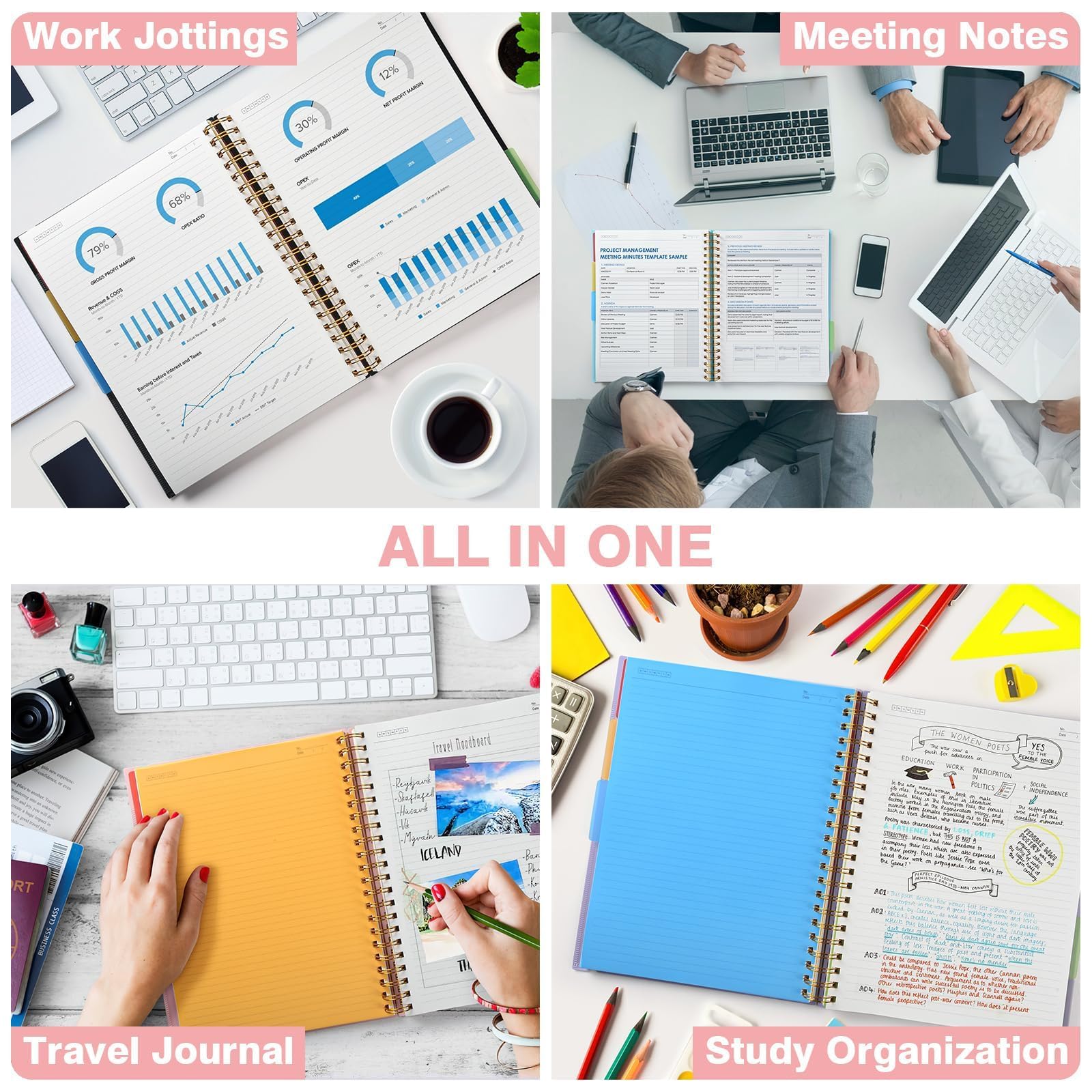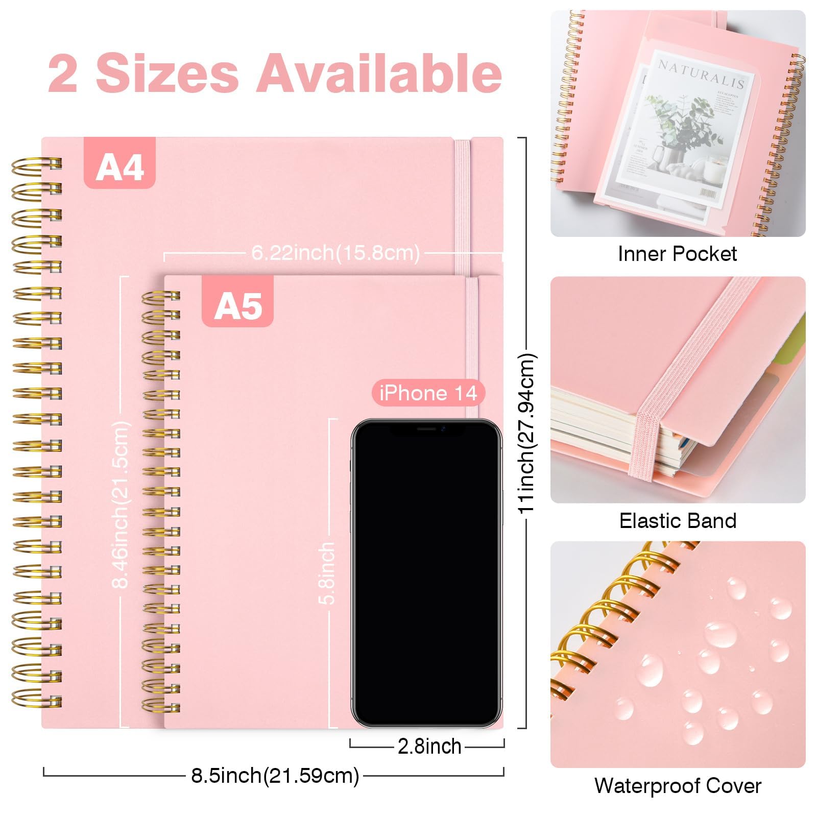 Notizblock, Notizbuch A5 Liniert, Notizbücher Mit 5 Fächern Und Herausnehmbaren Trennblättern, 300 Blatt 100GSM Spiral Notizbuch Softcover Zum Schreiben, Für Arbeit Und Schulbedarf, 15.8 x 21.5cm,Rosa