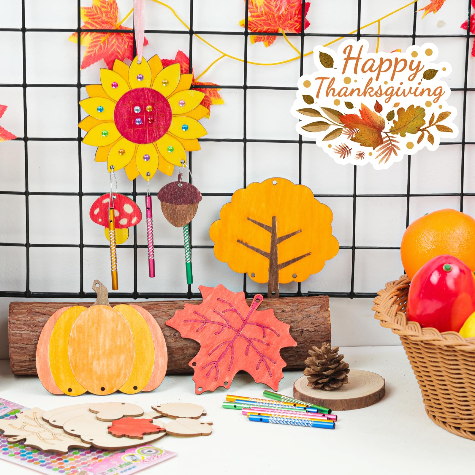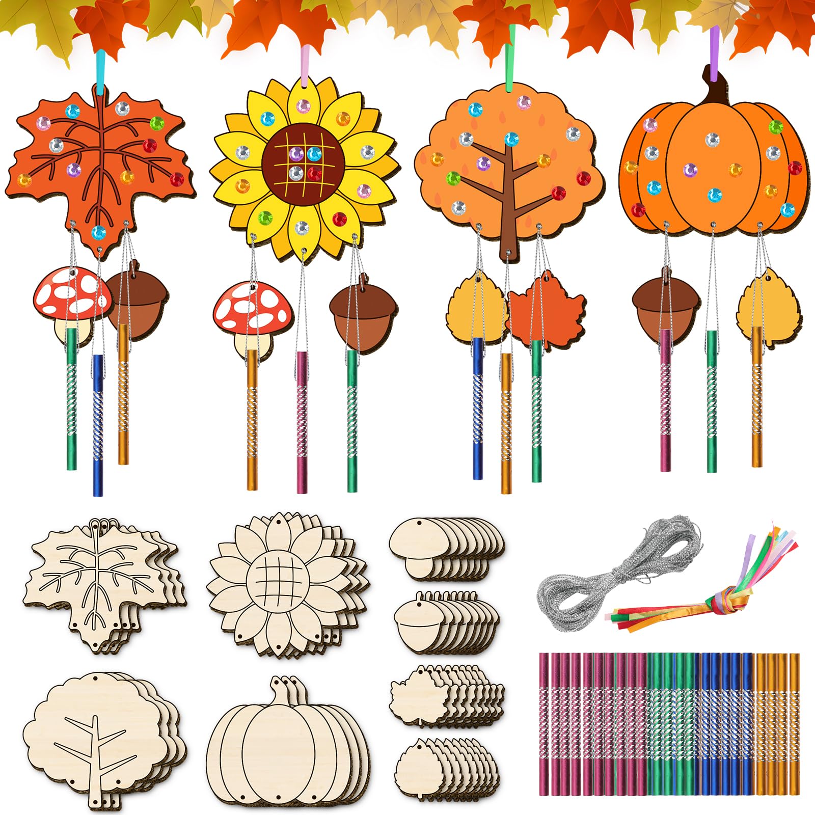 Nourdom 12tlg DIY Herbst Windspiel Bastelset Kinder, Holz Blatt Windspiele zum Bemalen mit Hängendem Klangspiele Kreativsets mit Diamant Aufkleber Geburtstag Geschenke für Mädchen Jungen