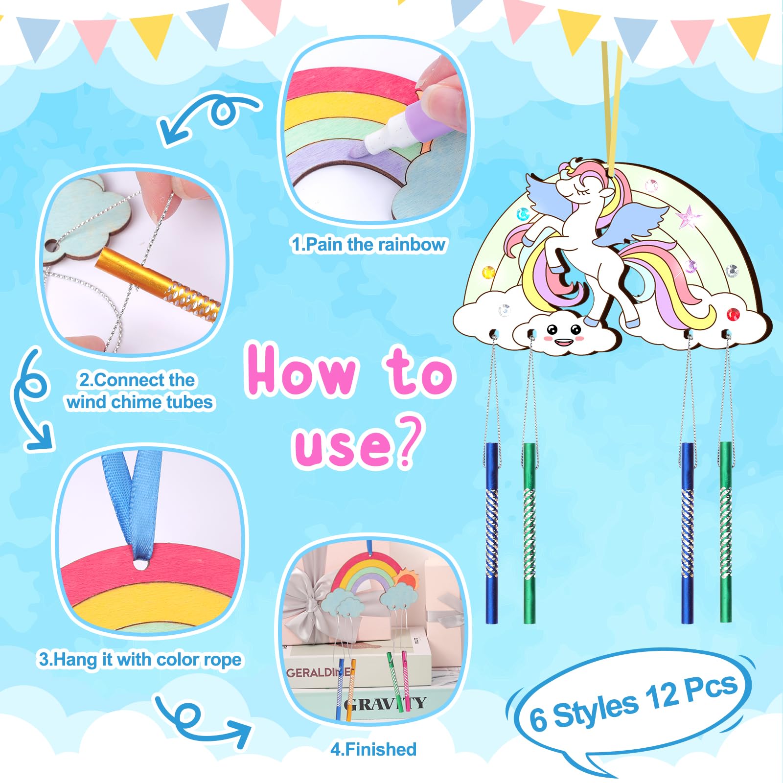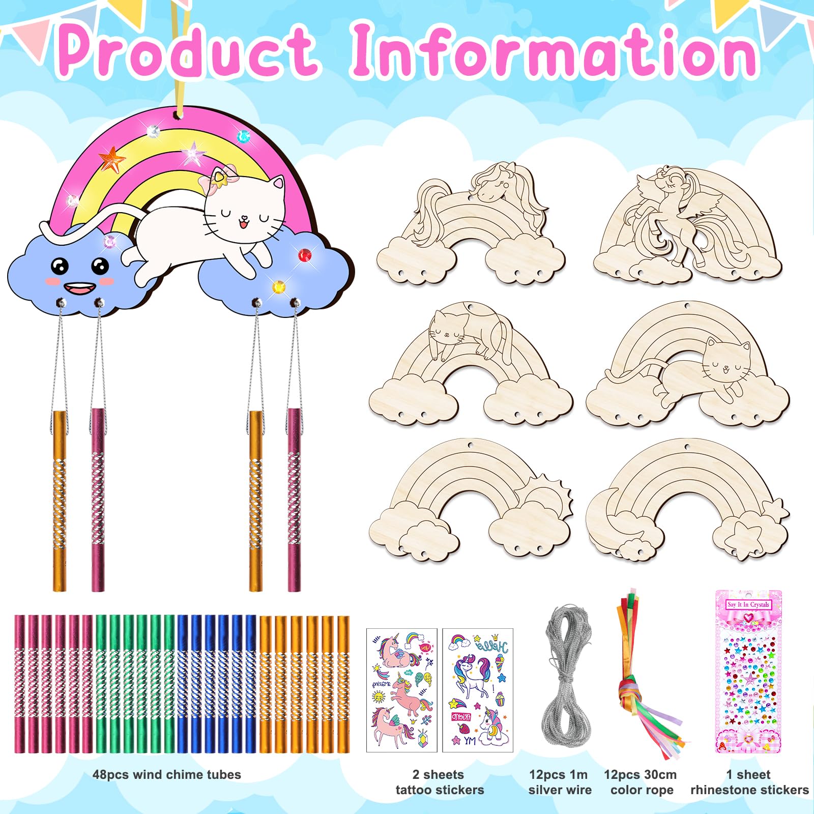 12 Stück Regenbogen Windspiel Bastelset Kinder Regenbogen Holz Klangspiel Basteln Bastelhandwerk zum Pferde Katzen Kreatives Bemalen Holz für Mädchen Junge Kindergeburtstag