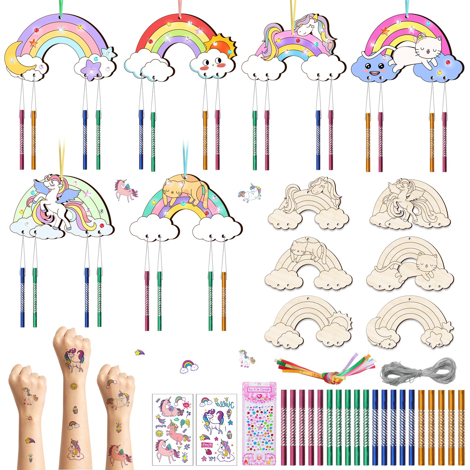 Nourdom 12 Stück Regenbogen Windspiel Bastelset Kinder Regenbogen Holz Klangspiel Basteln Bastelhandwerk zum Pferde Katzen Kreatives Bemalen Holz für Mädchen Junge Kindergeburtstag
