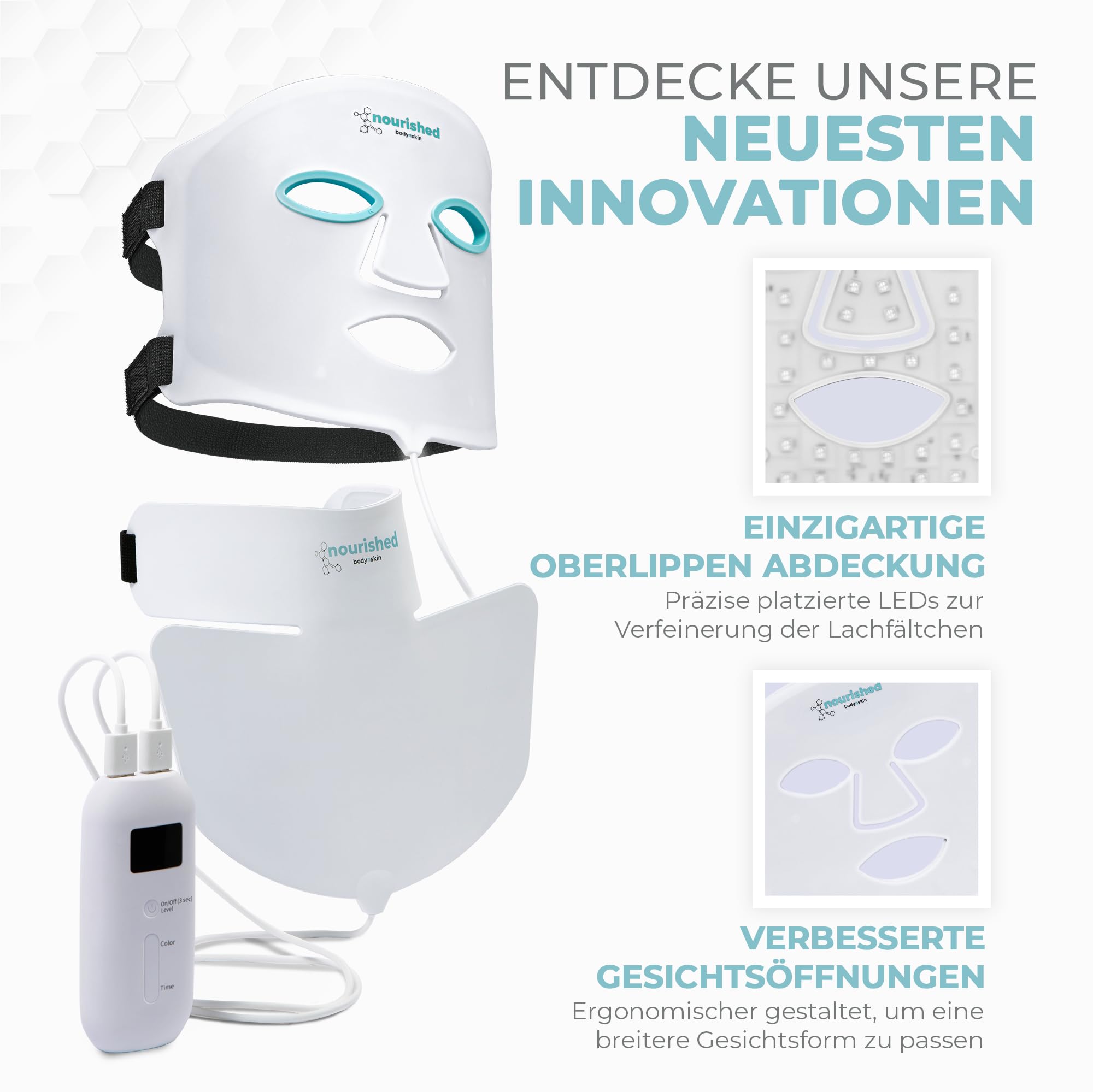 Die Nourished Bodynskin LED Lichttherapie Gesichts- & Halsmaske vereint innovative Technologie, komfortable Anwendung und zielgerichtete Pflege und ist die perfekte Wahl fuer eine moderne, wirkungsvolle Anti-Aging Beauty-Routine im eigenen Zuhause.