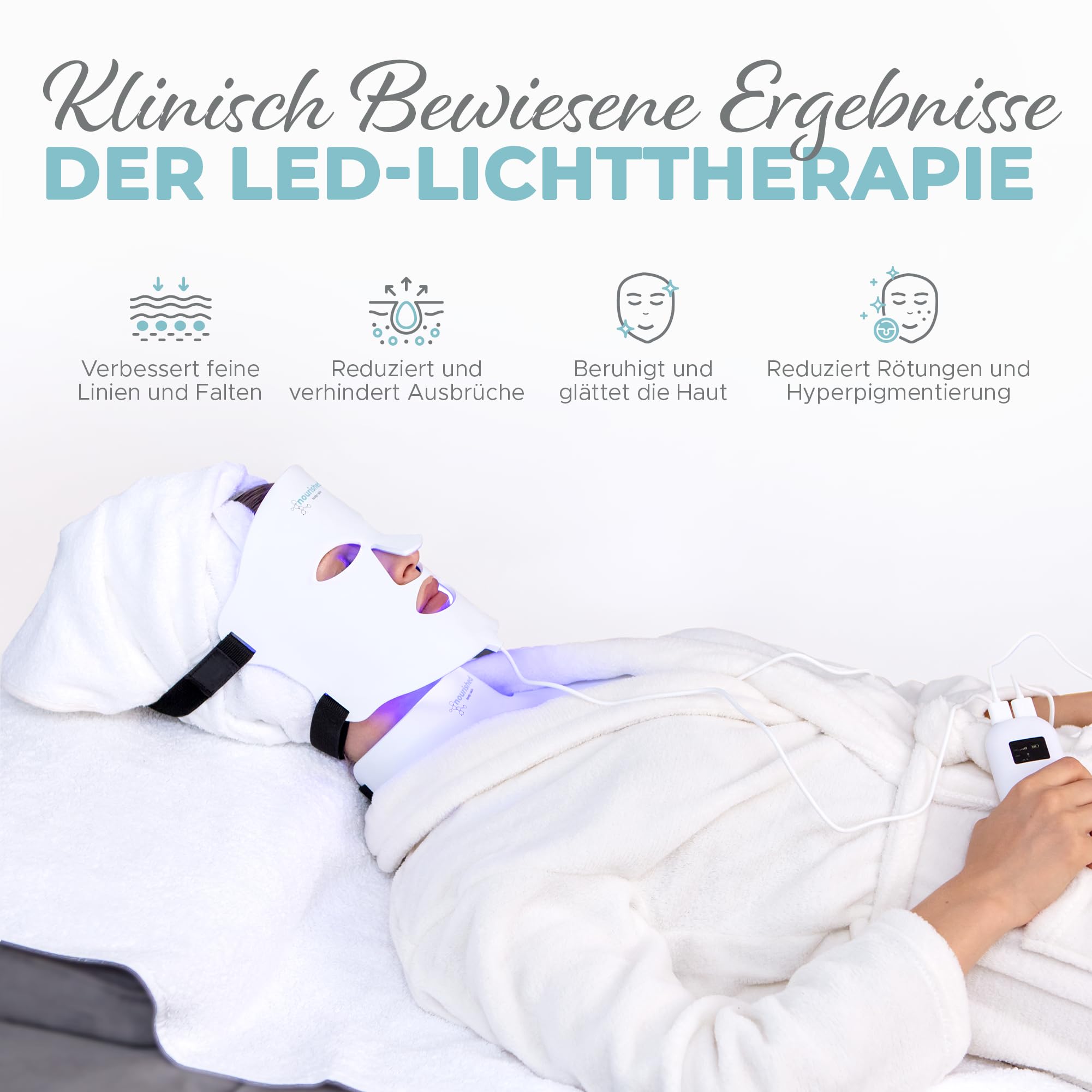 Die LED Lichttherapie kann dazu beitragen, das Erscheinungsbild der Haut zu verfeinern, den Teint auszugleichen und die Hautregeneration zu unterstuetzen. Die Rotlicht-Funktion wird haeufig fuer verjuengend wirkende Pflegekonzepte eingesetzt, waehrend Blaulicht besonders bei unausgeglichenem Hautbild beliebt ist. Die weiteren Lichtfarben ermoeglichen eine individuelle Anpassung an unterschiedliche Hautbeduerfnisse.