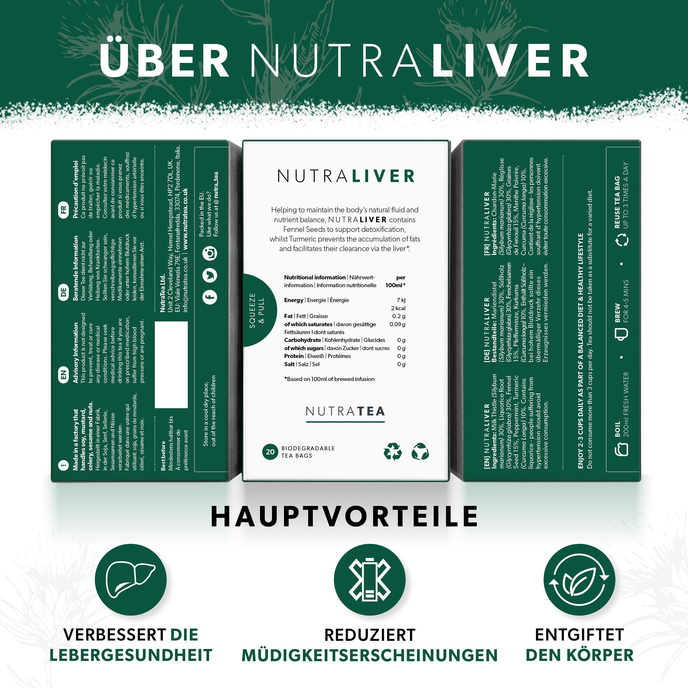 Nutra Tea NUTRALIVER, Detox Tee zum Entgiften der Leber, trägt zur Unterstützung der Leberregeneration & gesunde Verdauung bei, 60 wiederverwendbare Teebeutel, Leber Tee mit Mariendistel & Lakritz