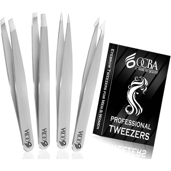 OCBA Silberfarbene Pinzette für Gesichtshaar, Damen und Herren, für präzise Pflege der Augenbrauen, professionelle Augenbrauen-Pinzette aus Edelstahl, schwarz beschichtet (4 Stück Silber)