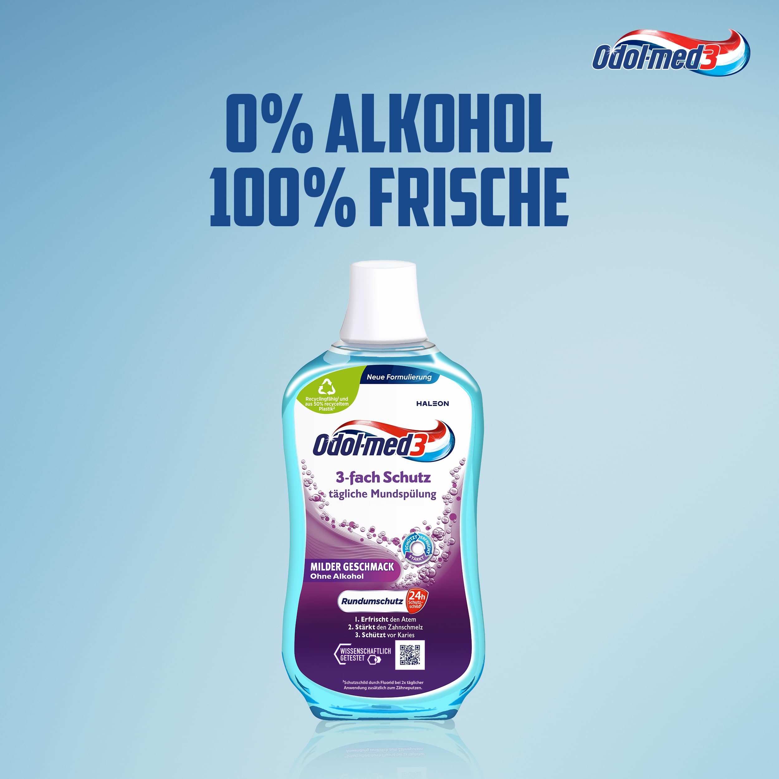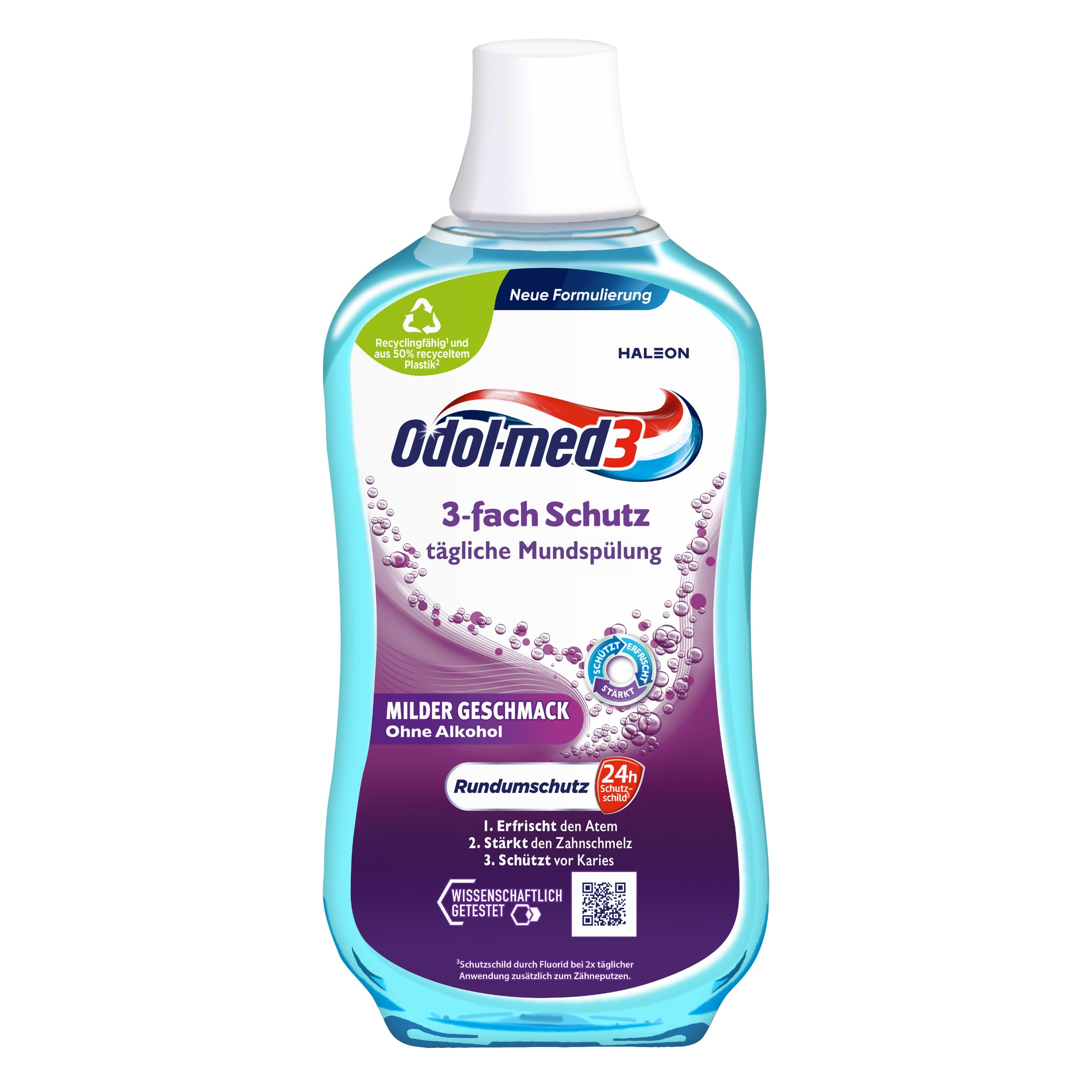 Odol-med3 Mundspülung, 3-Fach Schutz, alkoholfreie Mundspülung, stärkt den Zahnschmelz und erfrischt den Atmen, 500 ml