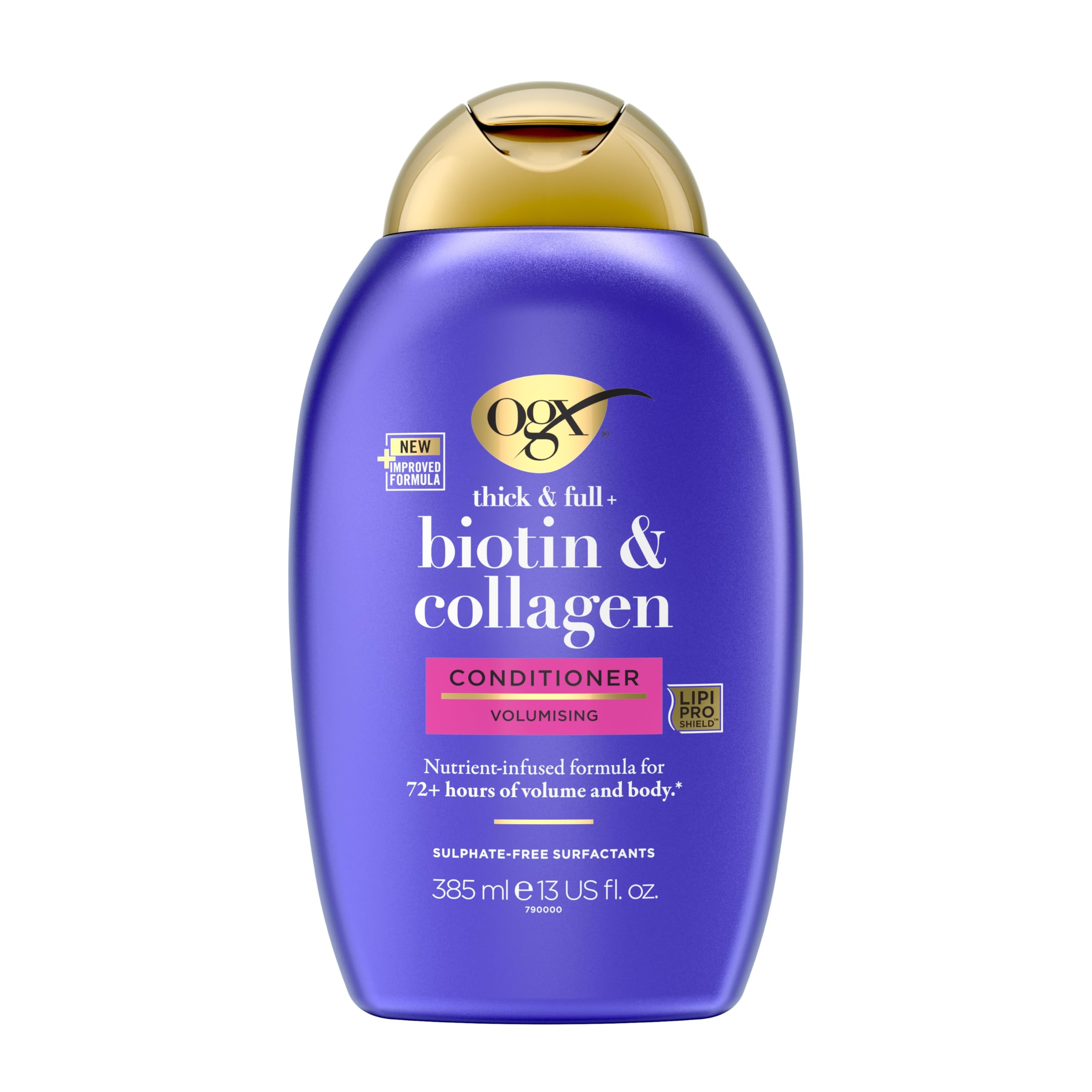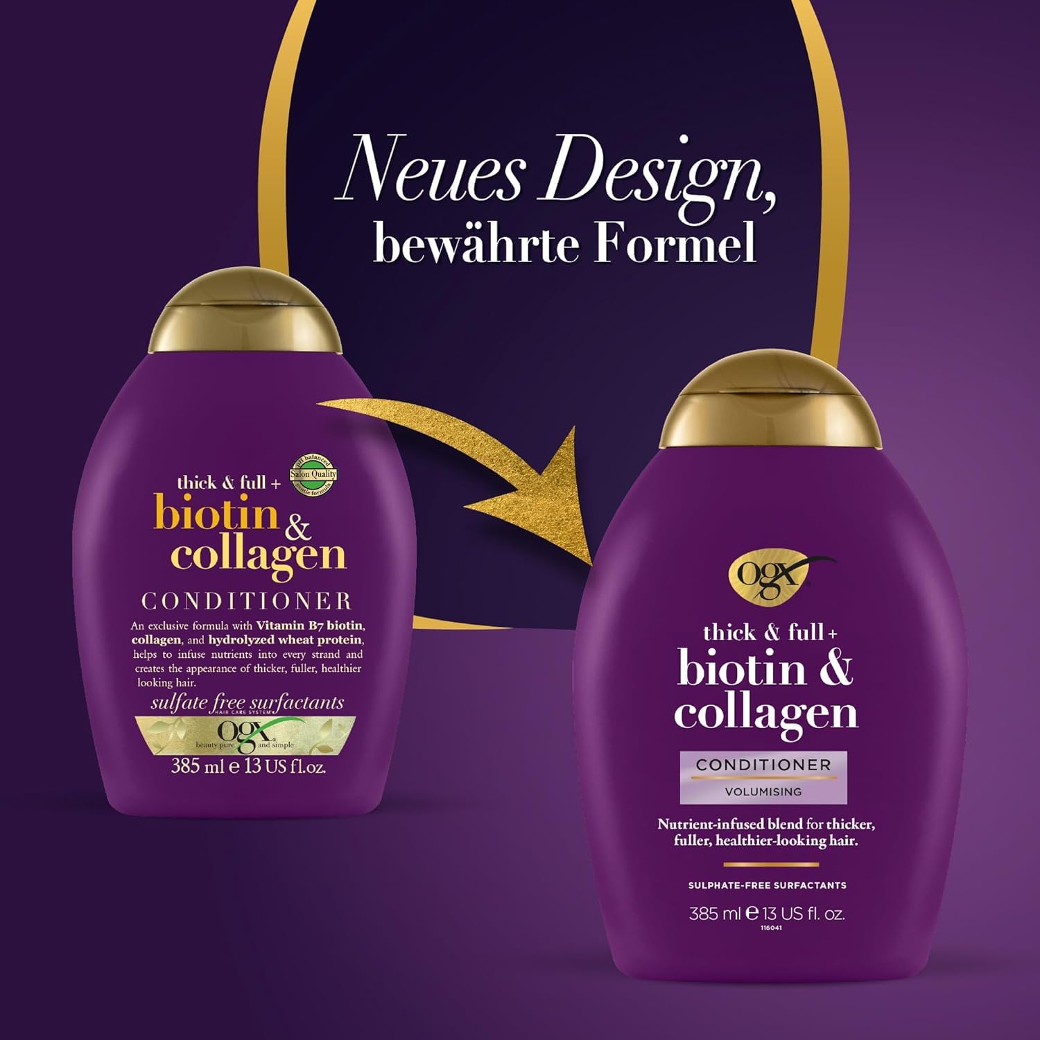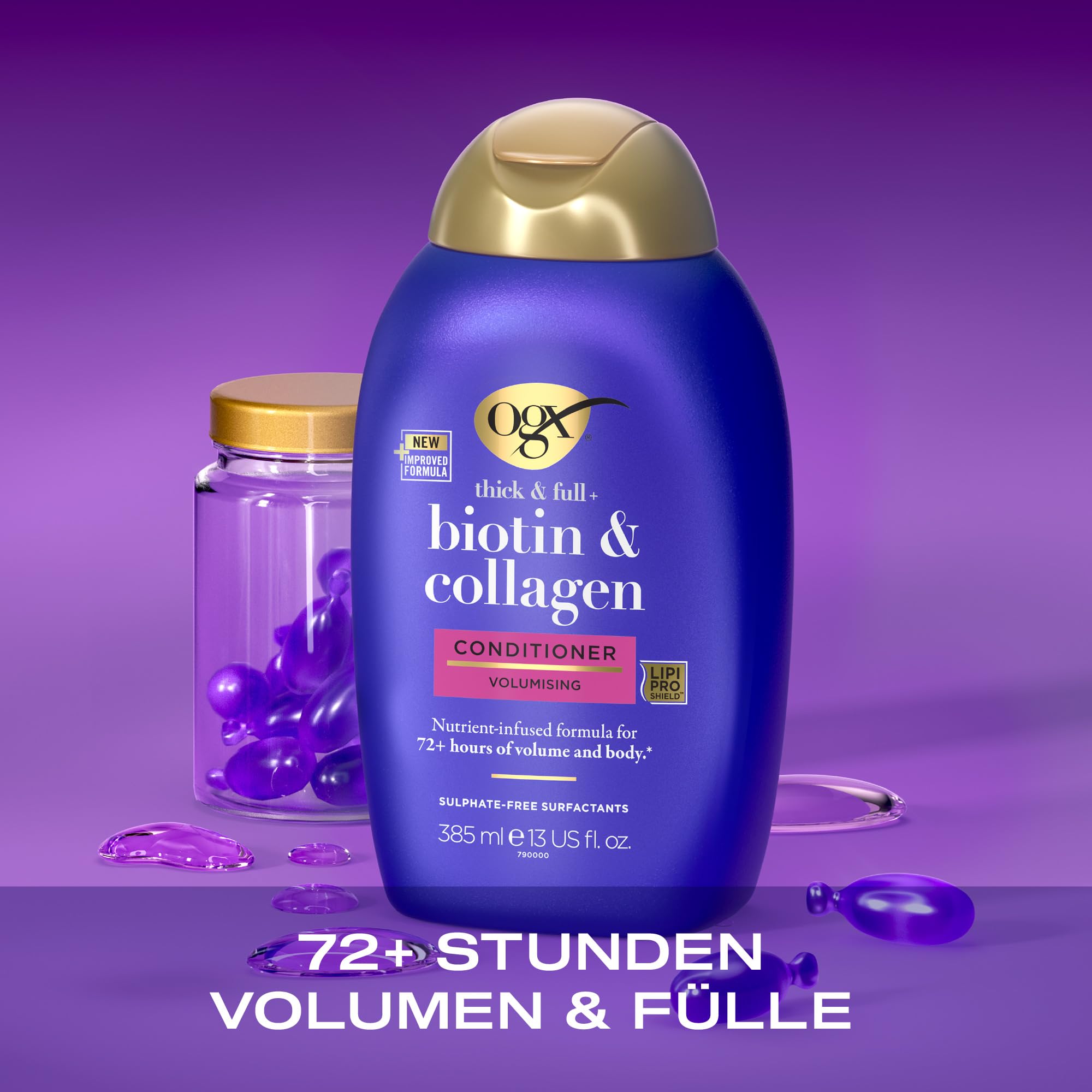 OGX Biotin & Collagen Conditioner (385 ml), reichhaltige Haarspülung für 72h+ Volumen & Fülle mit Biotin & Kollagen, Haarpflege Volumen Spülung für feines & dünnes Haar mit LipiPro Shield Technologie