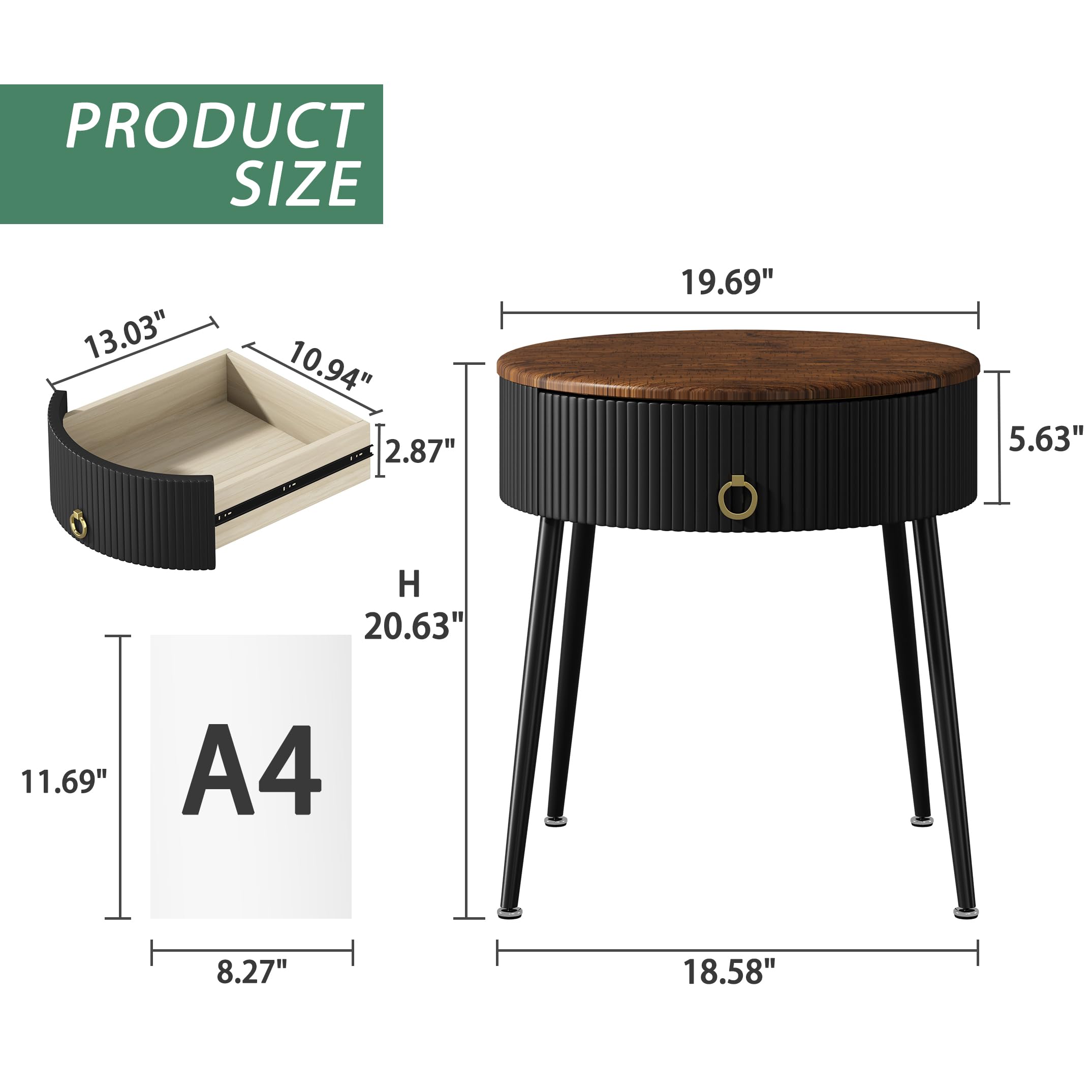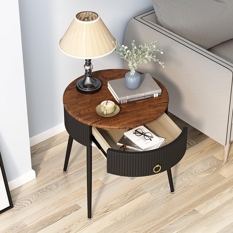 Ideal für enge Räume, dieser schwarze runde Nachttisch mit Schublade kann Lampen, Telefone, Bücher und mehr präsentieren, während die Schubladen zusätzlichen Stauraum bieten, der sich nahtlos in Ihre vorhandene Dekoration einfügt. Und der moderne runde Nachttisch hat Metallbeine und verstellbare Füsse für zusätzliche Stabilität und Stabilität.