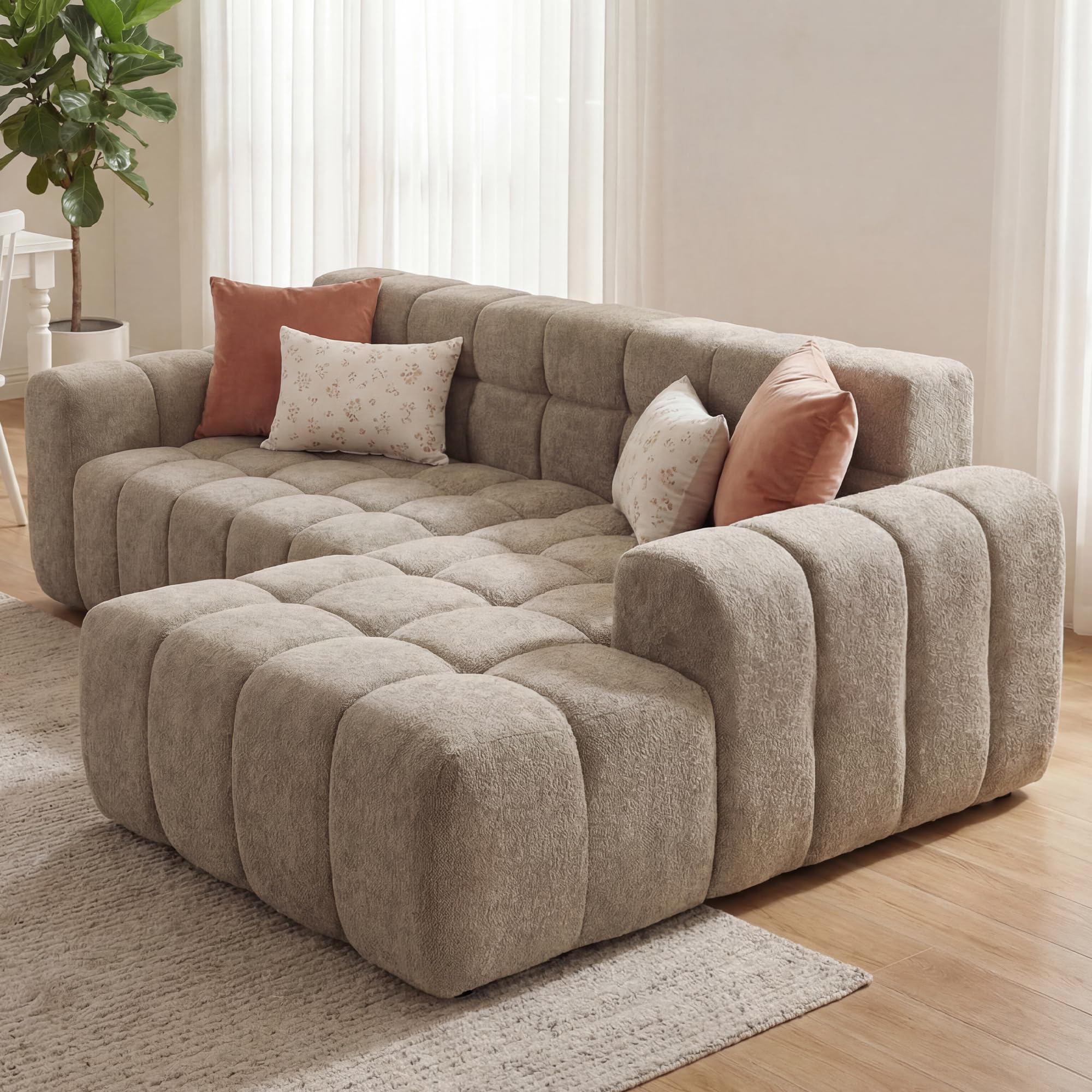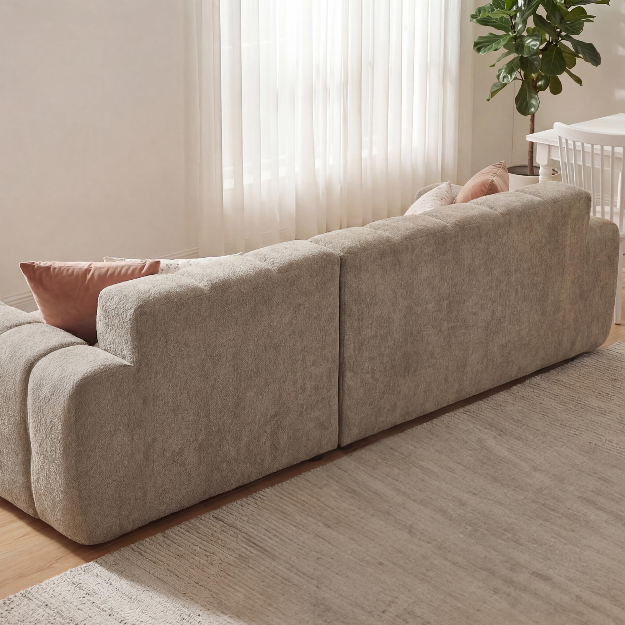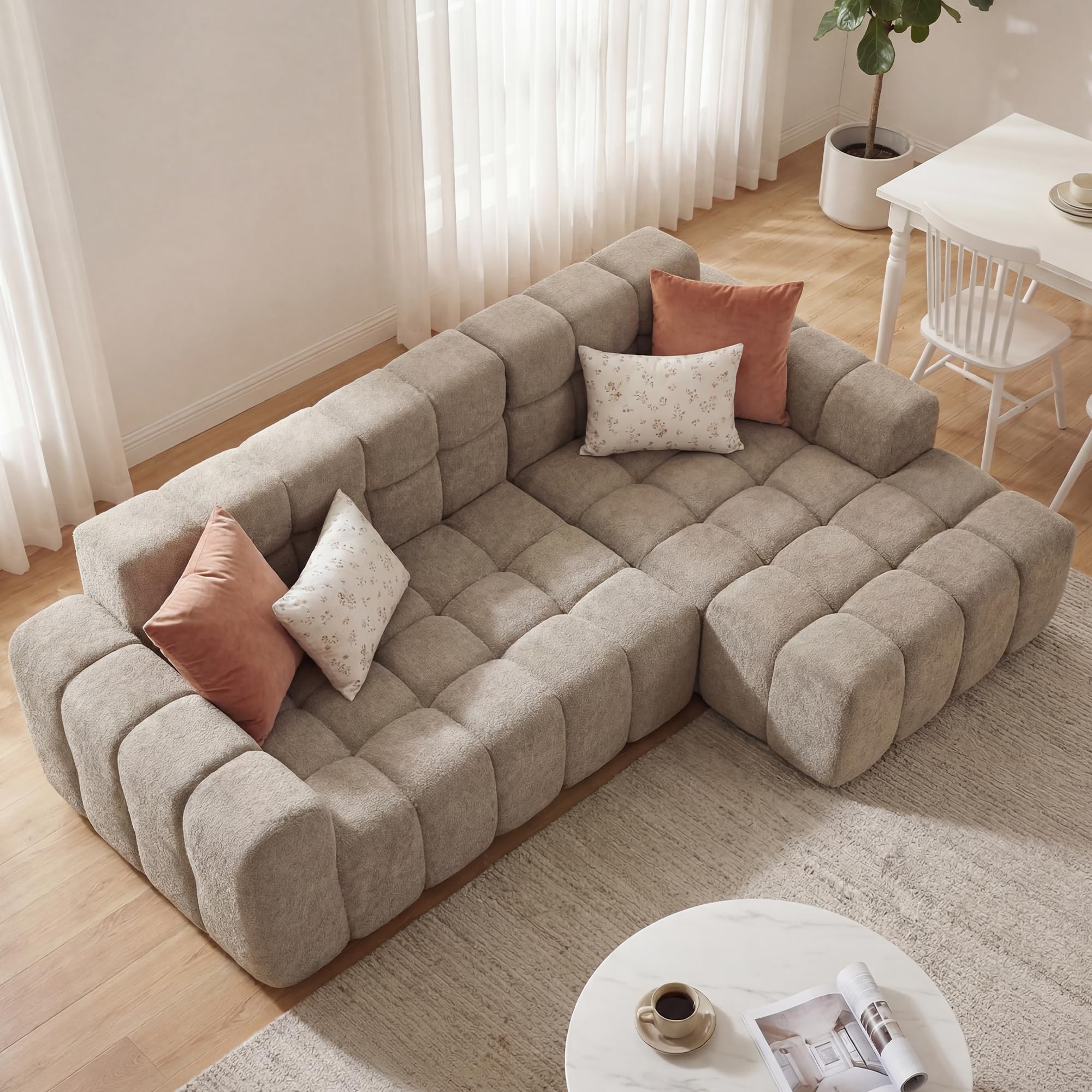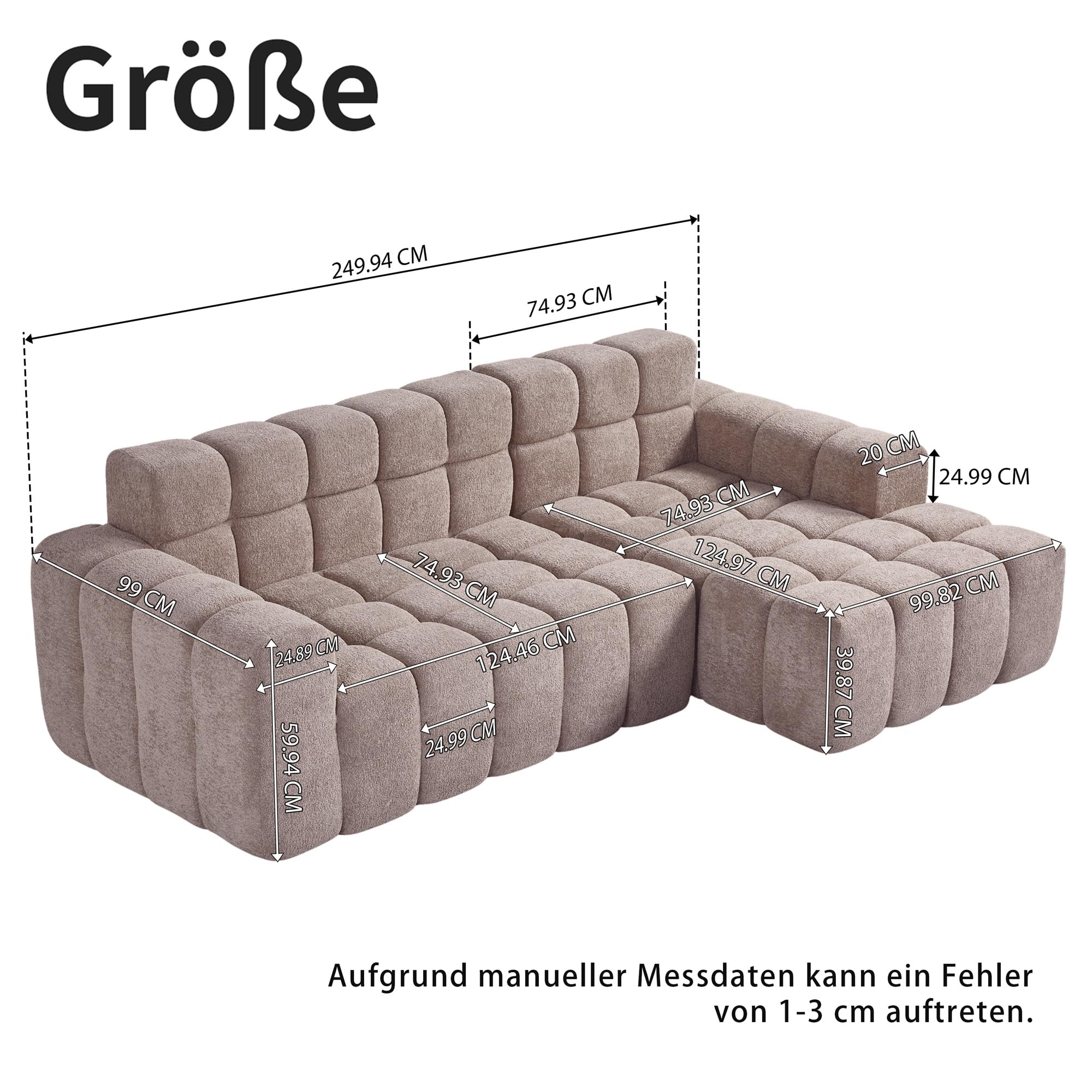 STIVORA – Stilvolles Wohnerlebnis: Modernes modulares Sofa für Ihr ZuhauseDas Sofa besteht aus weichem, hautfreundlichem Algenvelours und bietet dank hochdichtem Schaumstoff angenehmen Sitzkomfort. Die Sitzflächen sind extra tief und breit, sodass Rücken und Beine gut unterstützt werden. Durch das modulare Design lässt sich das Sofa flexibel an unterschiedliche Raumgrössen und Aufstellungen anpassen. Es wird komprimiert geliefert und kann direkt nach dem Auspacken genutzt werden, ohne dass Werkzeuge nötig sind. Die solide Verarbeitung sorgt für Stabilität und lange Nutzungsdauer.Abmessungen & DetailsProdukttyp: Modulares SofaPolstermaterial: AlgenveloursFarbe: Kaffeebraun, WeissGesamtlänge (Breite): ca. 249,94 cmHauptsofa Tiefe (Sitz bis Rückenlehne): 74,93 cmChaiselongue Tiefe: 99,82 cmRückenlehnenhöhe: 39,88 cm(Details siehe obige Masszeichnung)Sitzfüllung: SchaumstoffRückenfüllung: Schaumstoff mit PolsterungMit Armlehnen: JaVerpackungsart: VakuumverpacktZusätzliches Werkzeug erforderlich: Alle Werkzeuge im Lieferumfang enthaltenAnzahl der Pakete: 2Hinweise※ Aufgrund manueller Messung kann es zu Abweichungen von 2–3 cm kommen.※ Alle Produktbilder wurden mit dem Originalprodukt aufgenommen. Dennoch kann es durch Sonneneinstrahlung oder andere Einflüsse zu leichten Farbabweichungen kommen.※ Das Produkt wird in 2 Paketen versendet, die nicht gleichzeitig ankommen müssen. Bitte haben Sie etwas Geduld.