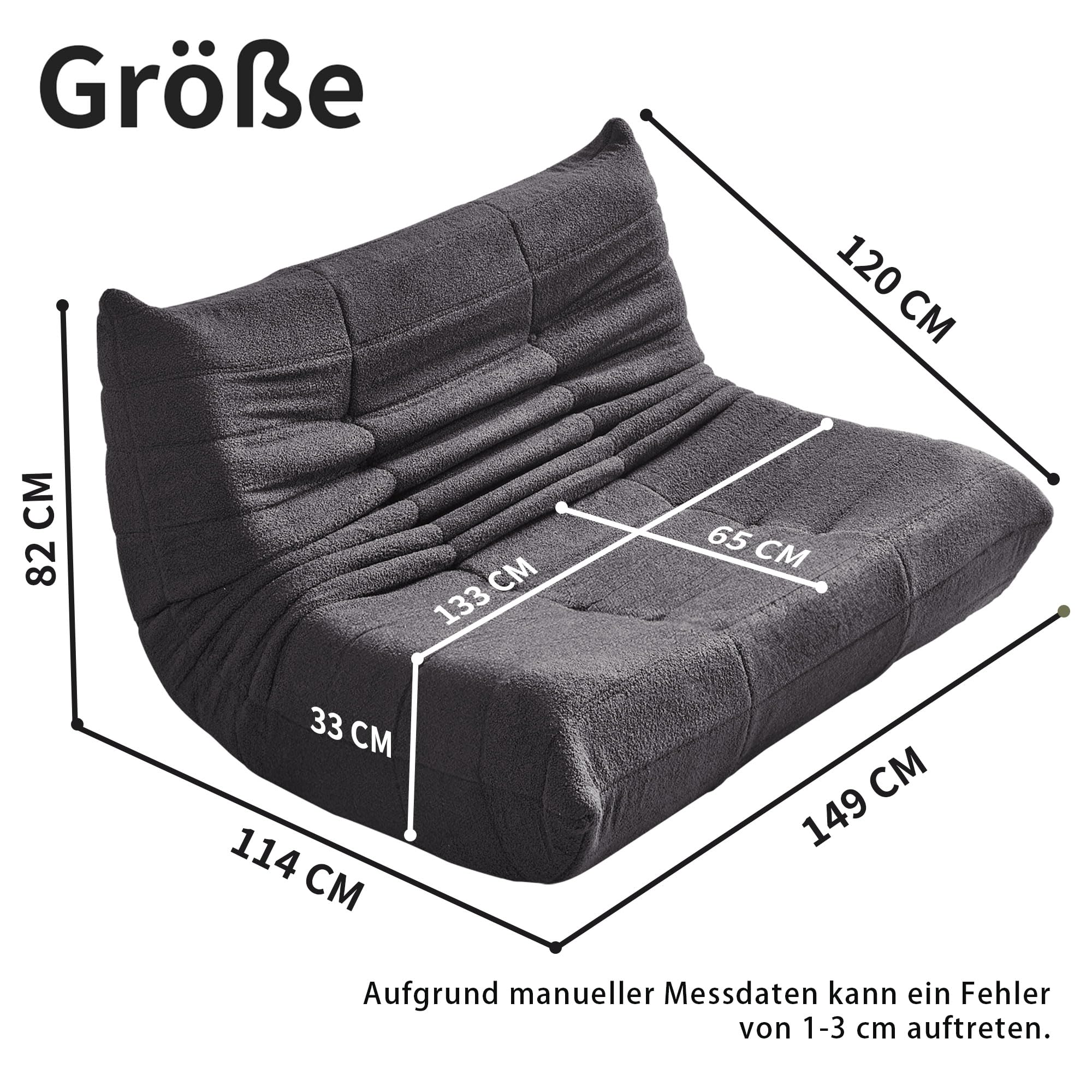 Produktabmessungen(cm)Grössen: 114x149×82(LxBxH)Sitzmasse: 65×133×33cm (LxBxH)Rückenlehnenhöhe - Sitz bis Oberkante der Rückenlehne: 82cmSitzhöhe - Boden bis Sitz: 33cmKissendicke: 33cm