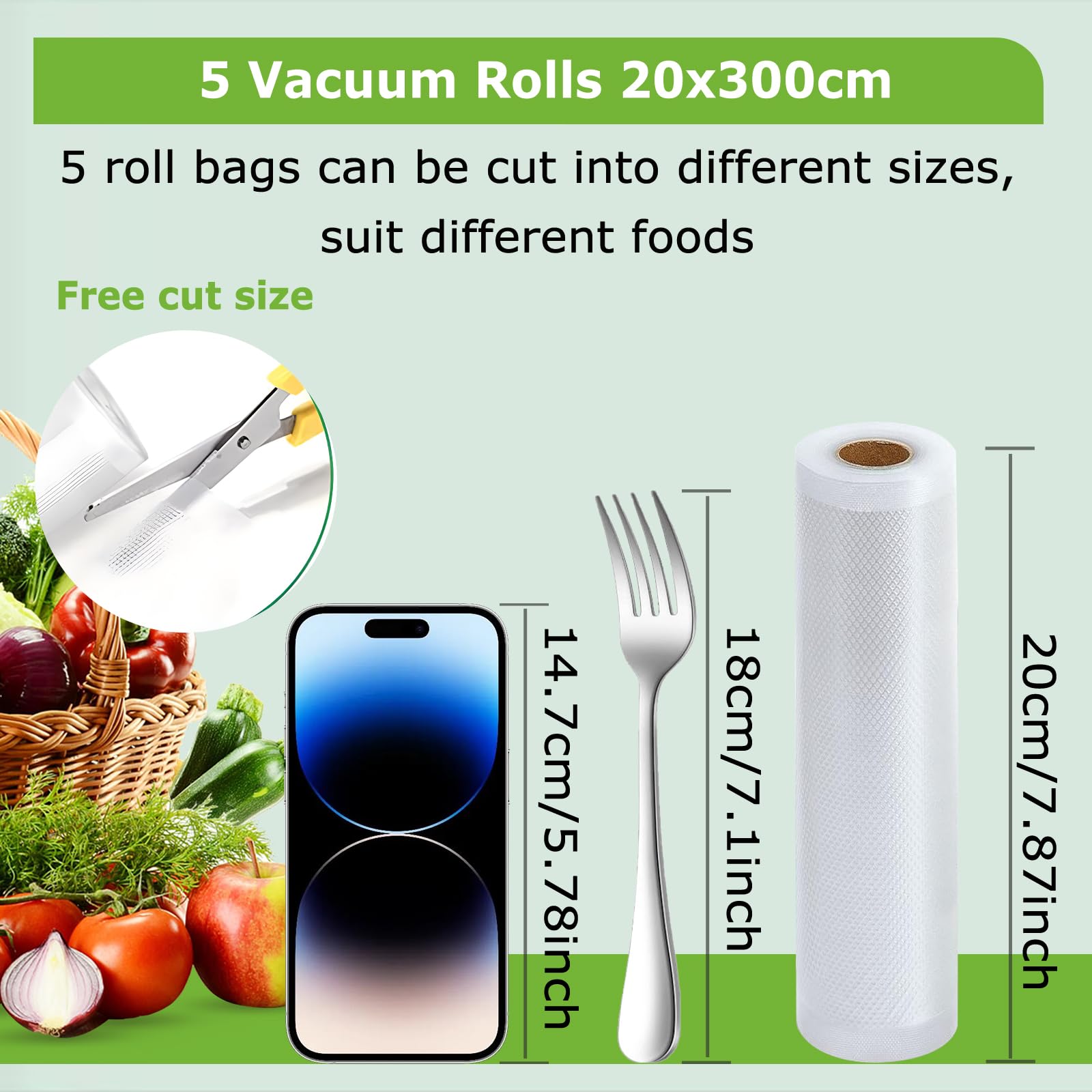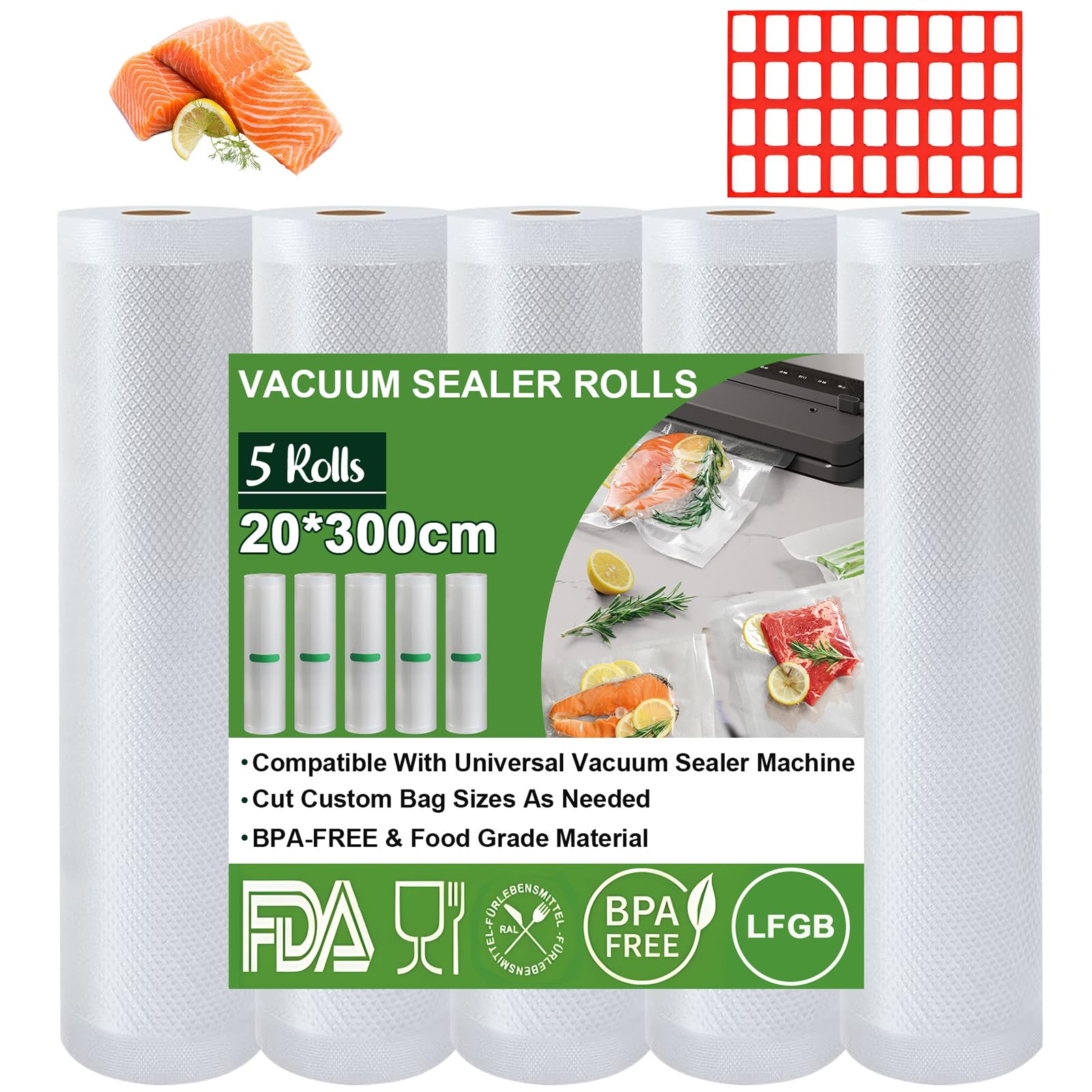 Omtofo Vakuumierbeutel 5 Rollen Vakuumierfolie, 20 x 300cm/Rolle Vakuumbeutel Lebensmittel, BPA-frei, reissfest, 190µm, Vakumierfolienrolle für Vakuumierer, Mikrowellen and Sous Vide