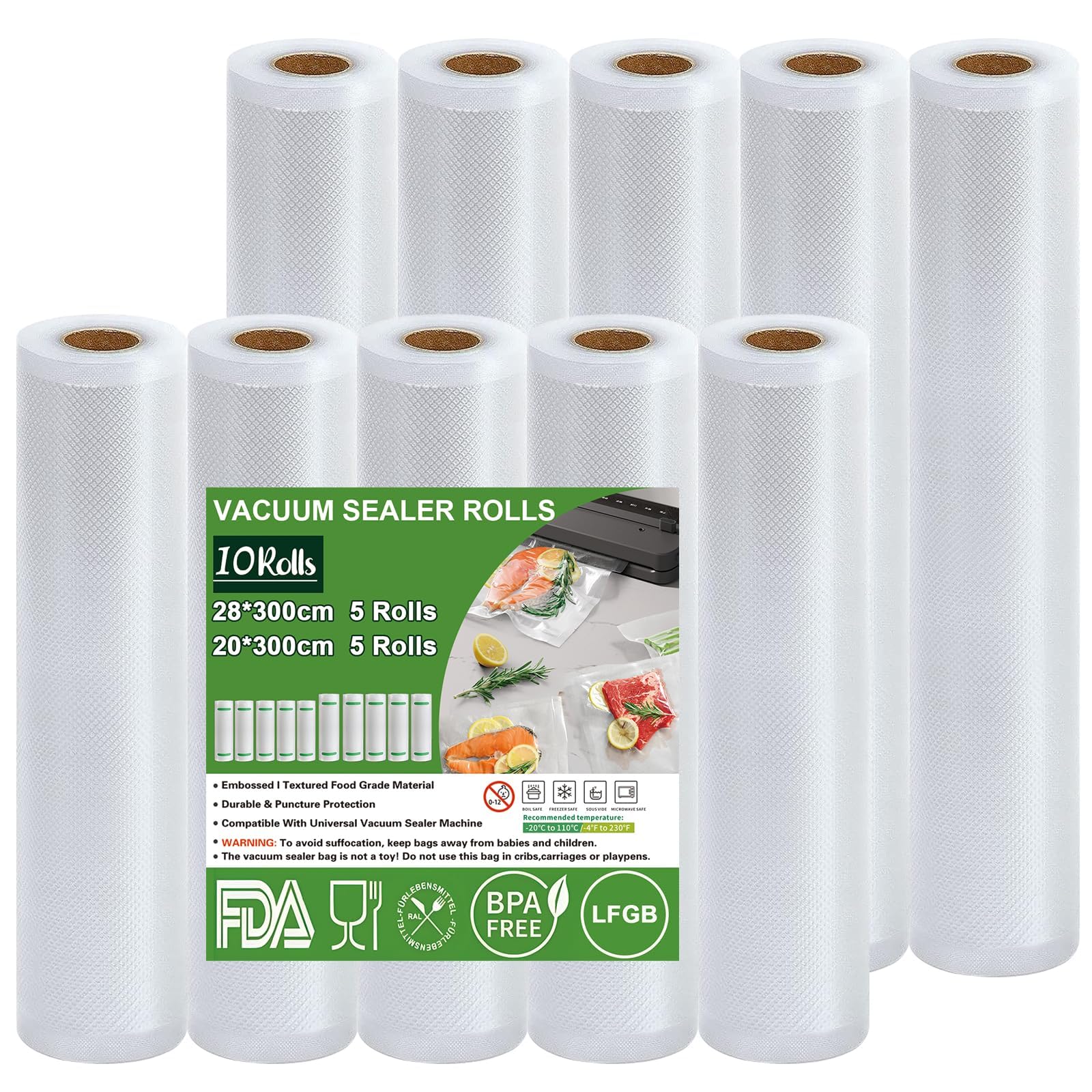 Omtofo Vakuumierrollen 5 Rollen 28x300cm + 5 Rollen 20x300cm Vakuumierfolie - Profi Vakuumbeutel für Vakuumierer Lebensmittel Vakuumiergerät, Kochfest und Sous Vide Gefrierbeutel, BPA-frei