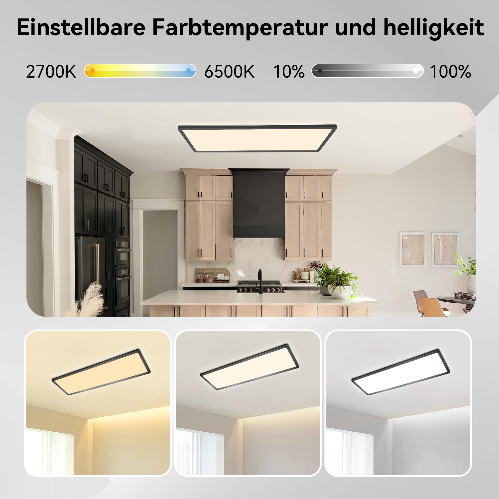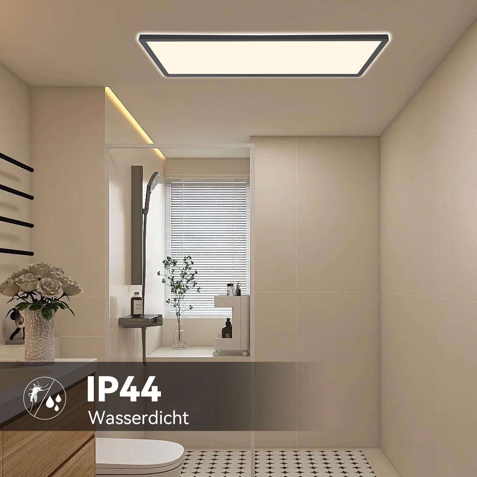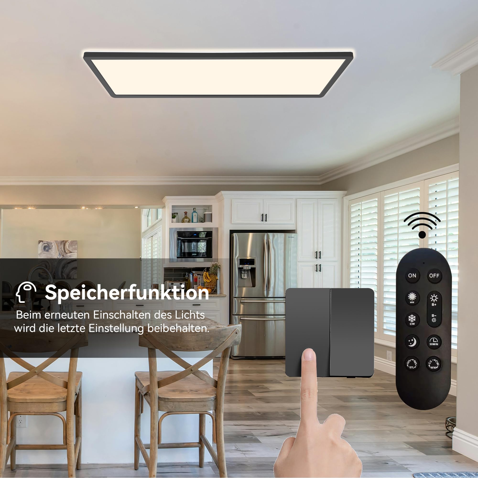 Verleihen Sie Ihrem Zuhause mit der Ondta Deckenleuchte LED eine moderne und stilvolle Beleuchtung. Diese elegante LED Panel Deckenleuchte bietet vielseitige Funktionalitäten und überzeugt mit ihrem innovativen Design. Mit einer Leistung von 22W und einer variablen Farbtemperatur von 2700K bis 6500K können Sie die Beleuchtung ganz nach Ihren Wünschen einstellen. Ideal für Wohnzimmer, Schlafzimmer, Badezimmer und Feuchträume, bietet sie eine angenehme und flimmerfreie Beleuchtung, die Ihre Augen schont. Produktmerkmale: Leistung: 22W Lichtleistung: 2800LM Farbtemperatur: 2700K-6500K (von warmweiss bis kaltweiss) Abmessungen: 58x20 cm Material: PP+PS (hochwertig und langlebig) Besondere Eigenschaften: Rechteckiges Design für moderne Innenräume Dimmbar für individuelle Helligkeitsanpassung Speicherfunktion: Behält die endgültige Helligkeitseinstellung bei IP44 wasserdicht: Ideal für den Einsatz in Feuchträumen Nachtlichtmodus: Sanfte Beleuchtung für die Nacht Flimmerfrei und augenfreundlich: Schont die Augen, auch bei langen Nutzungszeiten Lange Lebensdauer: Über 25.000 Betriebsstunden Zusätzliche Vorteile: Einfache Installation: Schnell und einfach an der Decke zu montieren Fernbedienung inklusive: Komfortable Steuerung der Leuchte aus der Ferne Energieeffizient: Spart Energie im Vergleich zu herkömmlichen Deckenleuchten Verwendungsbereich: Die Ondta Deckenleuchte dimmbar eignet sich hervorragend für Feuchträume wie Badezimmer und Küchen, kann aber auch in Wohnzimmern, Fluren oder Schlafzimmern eingesetzt werden. Die ideale Wahl für alle, die eine energieeffiziente und komfortable Beleuchtung wünschen. Verwenden Sie die Fernbedienung, um die Helligkeit anzupassen, die Farbtemperatur zu wählen und den Nachtlichtmodus zu aktivieren – alles nach Ihrem Bedarf. Geniessen Sie die hochwertige Beleuchtung mit Ondta Deckenleuchte, die nicht nur funktional, sondern auch ästhetisch ist.