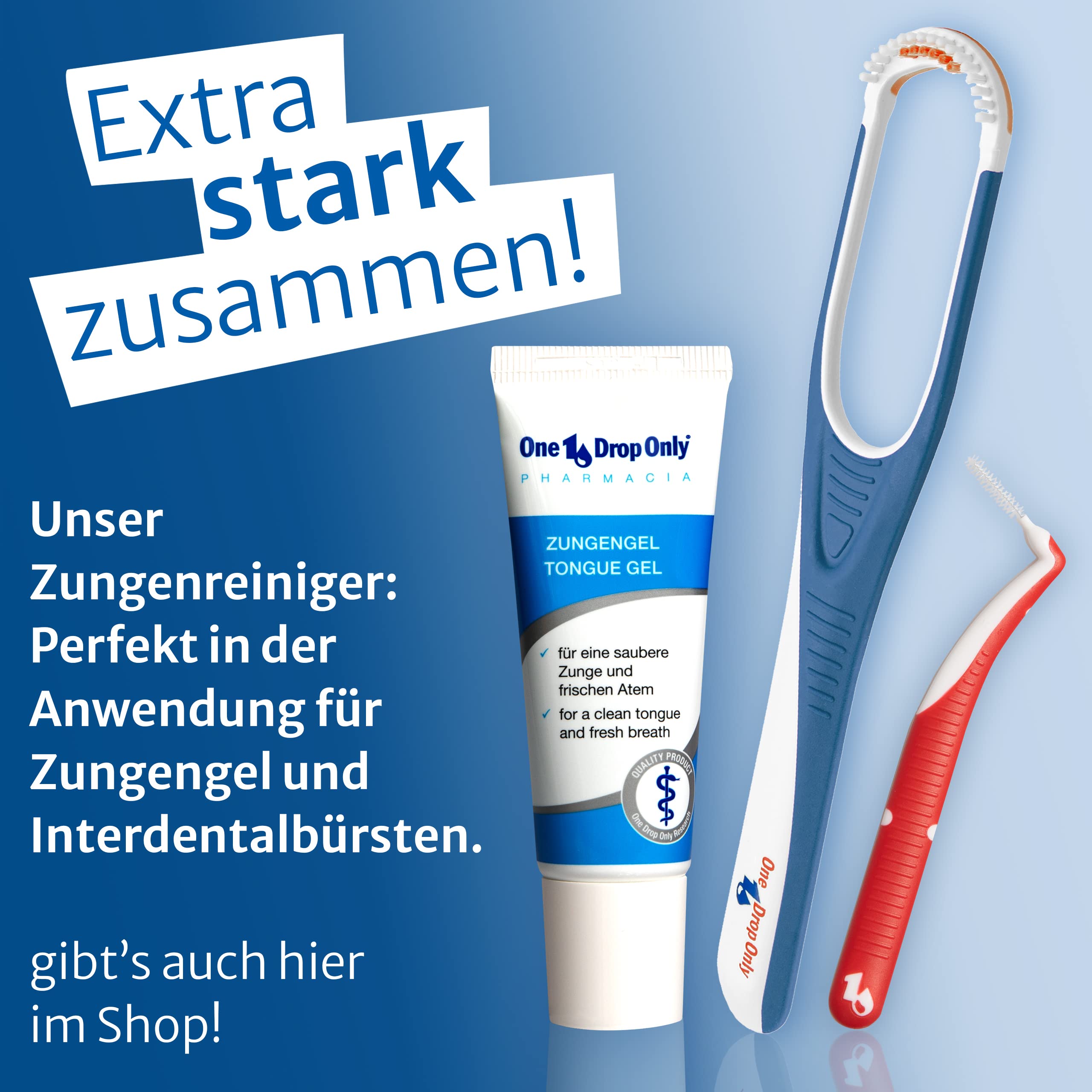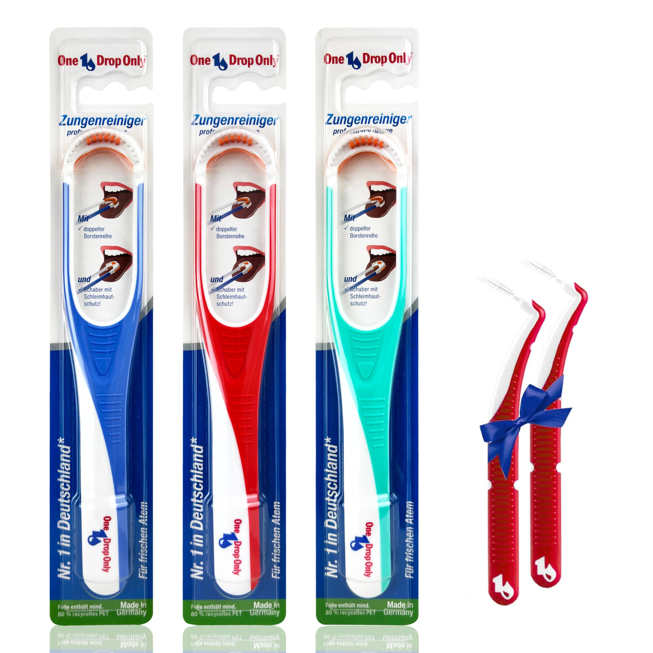 Zungenbürste und Schaber richtig anwenden: Zunächst einmal wollen wir Ihnen erklären, wie die Zungen Reinigung mit einem Zungenreiniger funktioniert: Mit der doppelten farbigen Bürstenseite unseres Zungenreinigers professional deluxe streichen Sie über die Rückseite Ihrer Zunge. Unter dem Druck der Borsten lösen sich die dort befindlichen Beläge vom Zungenrücken. Sobald dies geschehen ist, kommt der Schaber zum Einsatz. Die Schaberseite ziehen Sie nun langsam über die Rückseite Ihrer Zunge, wodurch Sie die gelösten Beläge aus dem Mundraum entfernen. Die Anwendung des Zungenreinigers ist einfach: Ziehen Sie den One Drop Only Zungenreiniger mit der Borstenseite unter gleichmässigem Druck mehrmals von hinten nach vorne über die herausgestreckte Zunge. Zwischen die beiden Borstenreihen können Sie zusätzlich unser Reinigungsgel auftragen. Drehen Sie dann den Zungenputzer um und wiederholen Sie die gleiche Bewegung mit dem Zungenspachtel. Eine eventuelle Reizung des Rachens kann durch das Festhalten der Zungenspitze mit einem Tuch unterdrückt werden. Im Anschluss können Sie, ganz nach Bedarf, noch eine Mundspülung gegen Mundgeruch verwenden, um die Wirkung des Zungenreinigers zusätzlich zu unterstützen. Wie oft sollte ich einen Toungescraper benutzen? Im Idealfall verwenden Sie Ihren Zungenreiniger zweimal täglich, jeweils nach dem Putzen der Zähne. Die Häufigkeit der Nutzung lässt sich, je nach Dringlichkeit, natürlich auch flexibel variieren. Achten Sie allerdings darauf, dass eine häufigere Anwendung pro Tag langfristig die Schleimhaut der Zunge strapazieren kann. Wann sollte ich einen neuen Zungenreiniger nutzen? Die Antwort auf diese Frage ist abhängig von der Häufigkeit der Nutzung. Benutzen Sie Ihren Tounge Scraper 1-2 mal am Tag, dann sollten Sie ihn nach spätestens anderthalb Monaten auswechseln. Wir empfehlen, nach etwa 4-6 Wochen einen neuen Zungenspatel zu kaufen.