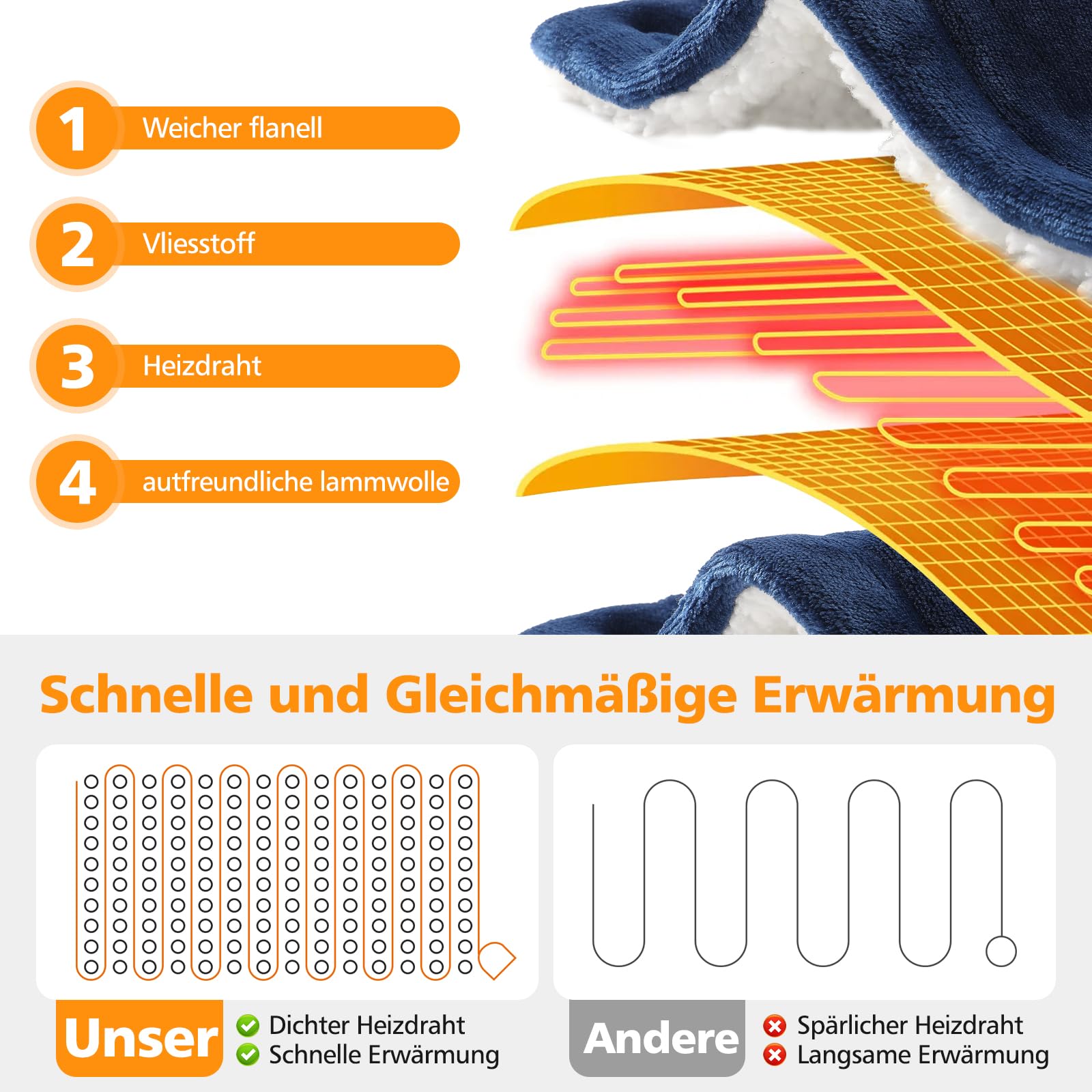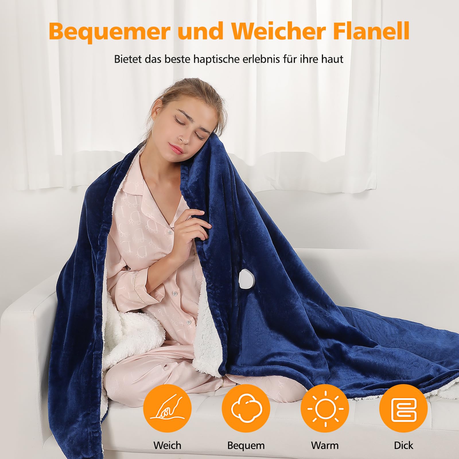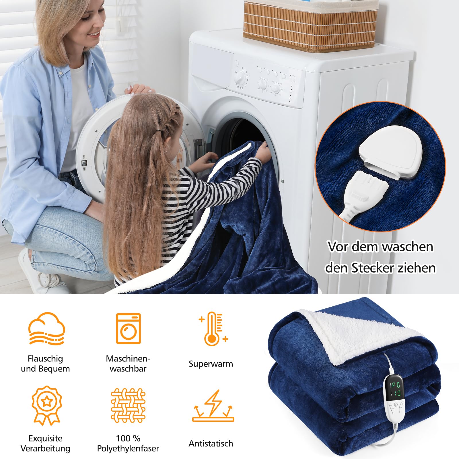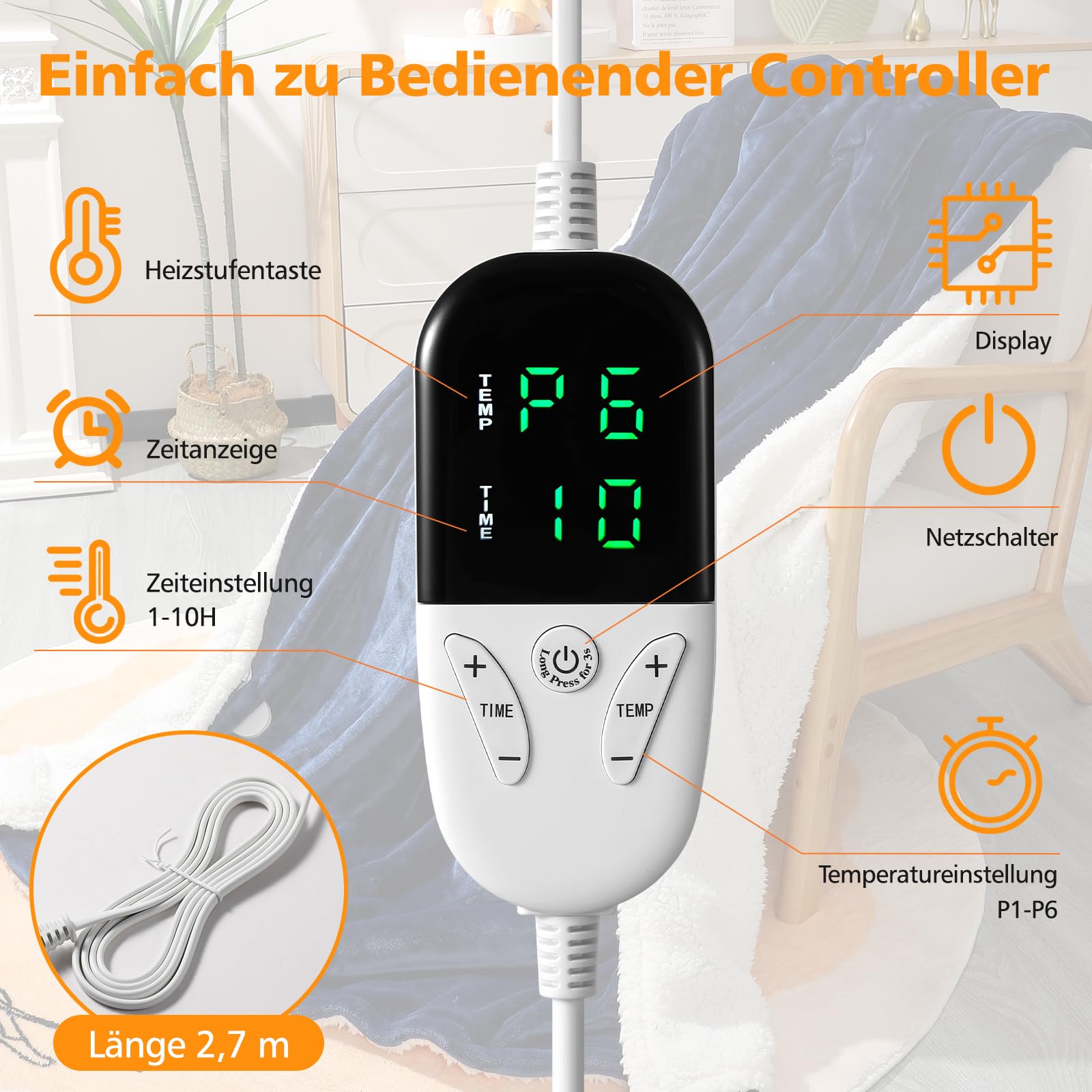 OneAmg Heizdecke mit Abschaltautomatik, 155 x 180cm Mit Fusstasche 10-Stunden-Timer und 6 Heizstufen, Wärmedecke Elektrisch- Mit Digitaler Fernbedienung, Maschinenwaschbar,Heated Blanket Blau