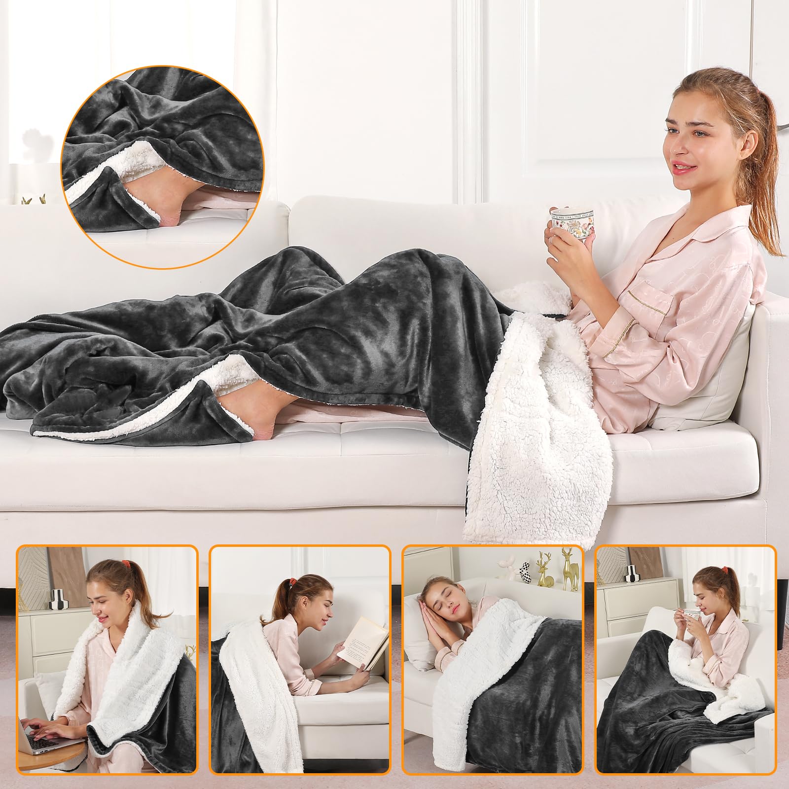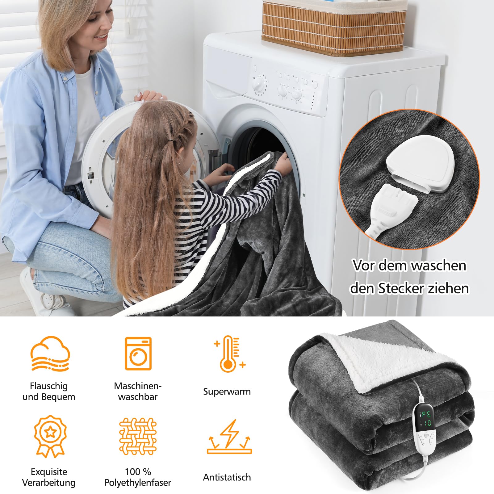 OneAmg Heizdecke mit Abschaltautomatik, 155 x 180cm Mit Fusstasche 10-Stunden-Timer und 6 Heizstufen, Wärmedecke Elektrisch- Mit Digitaler Fernbedienung, Maschinenwaschbar,Heated Blanket Grau