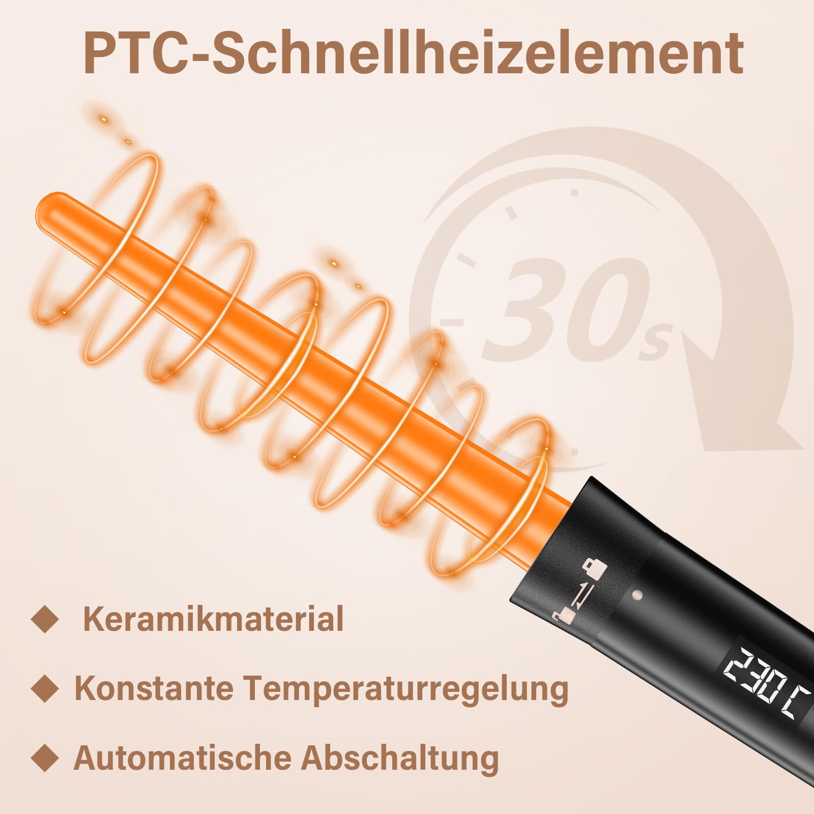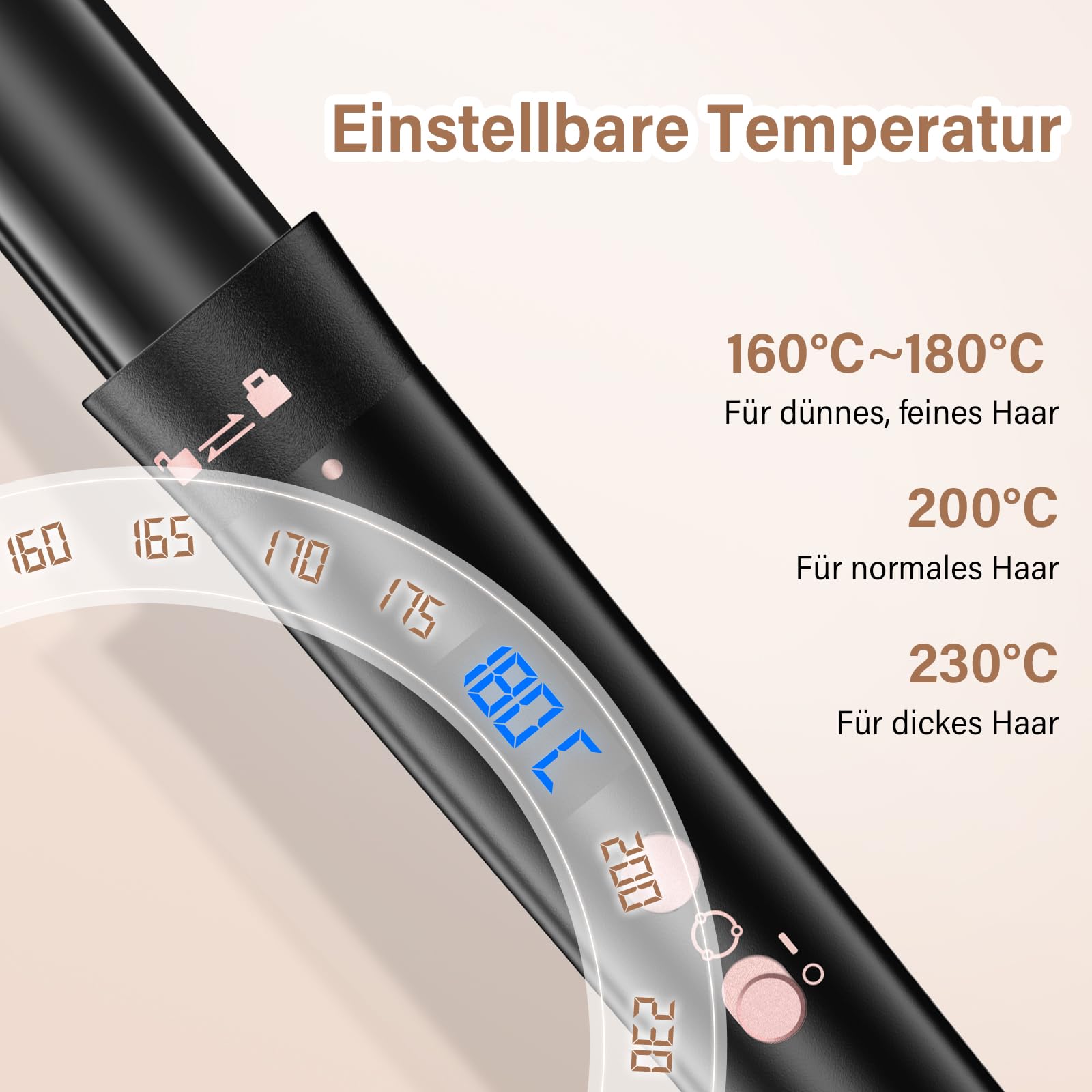 • 【Einstellbare Temperatur】Dieses Curling Iron verwendet die professionelle PTC-Heiztechnik, die eine schnelle Erwärmung in nur 30 Sekunden ermöglicht - kein langes Warten mehr. Es dauert nur 10 Minuten, um schnell auffällige Wellen-Frisuren zu kreieren. Die Temperatur dieses Haarwellen-Glätteisens kann zwischen 160 °C und 230 °C eingestellt werden, geeignet für feines, normales oder dickes Haar. Das klare LCD-Display zeigt die Temperatur in Echtzeit an, sodass Sie die ideale Temperatur nach Ihren Stylingbedürfnissen wählen können