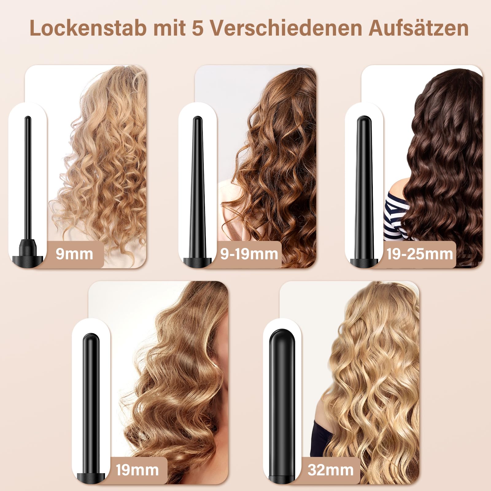 • 【Schaffen Sie mehr Frisuren】Dieser Lockenstab enthält 5 Keramik- und Tourmalin-Stäbe (eine 32 mm, eine 19 mm, einen konischen Stab von 9 – 19 mm, einen konischen Stab von 19 – 25 mm und einen 9 mm): Die grosse Auswahl an Grössen maximiert die Funktionalität. Dank der verschiedenen Grössen ermöglicht dieser professionelle Lockenstab jede Art von Frisur, wie Spiral-Locken, gewellte Locken, grosse voluminöse Locken, die die Wirkung des Haarkörpers verstärken, und kleine zarte und witzige Locken