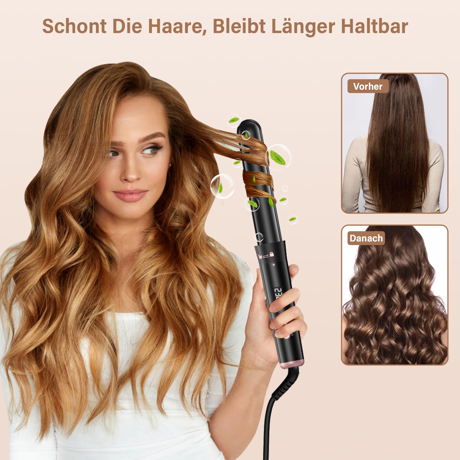 • 【Keramik- und Tourmalin-Beschichtungstechnologie】Dieser 5-in-1-Lockenstab verwendet auf innovative Weise das Material aus Keramik und Tourmalin, seine einzigartige Technik sorgt für eine gleichmässige Wärmeverteilung und verhindert Schäden durch übermässige Temperaturen an bestimmten Stellen. Die negative Ionen-Technologie hilft, statische Elektrizität und verfilztes Haar zu reduzieren, und während Sie Ihr Haar sanft pflegen, ermöglicht es Ihnen, leicht grosse, helle, bewegliche und natürlich flexible Locken ohne Steifigkeit zu erzeugen