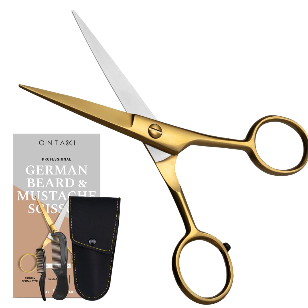 Ontaki 5“ Professionelle deutsche Bart- und Schnurrbartschere mit 2 Kämmen und Tragetasche für Männer (Goldenes Messing)