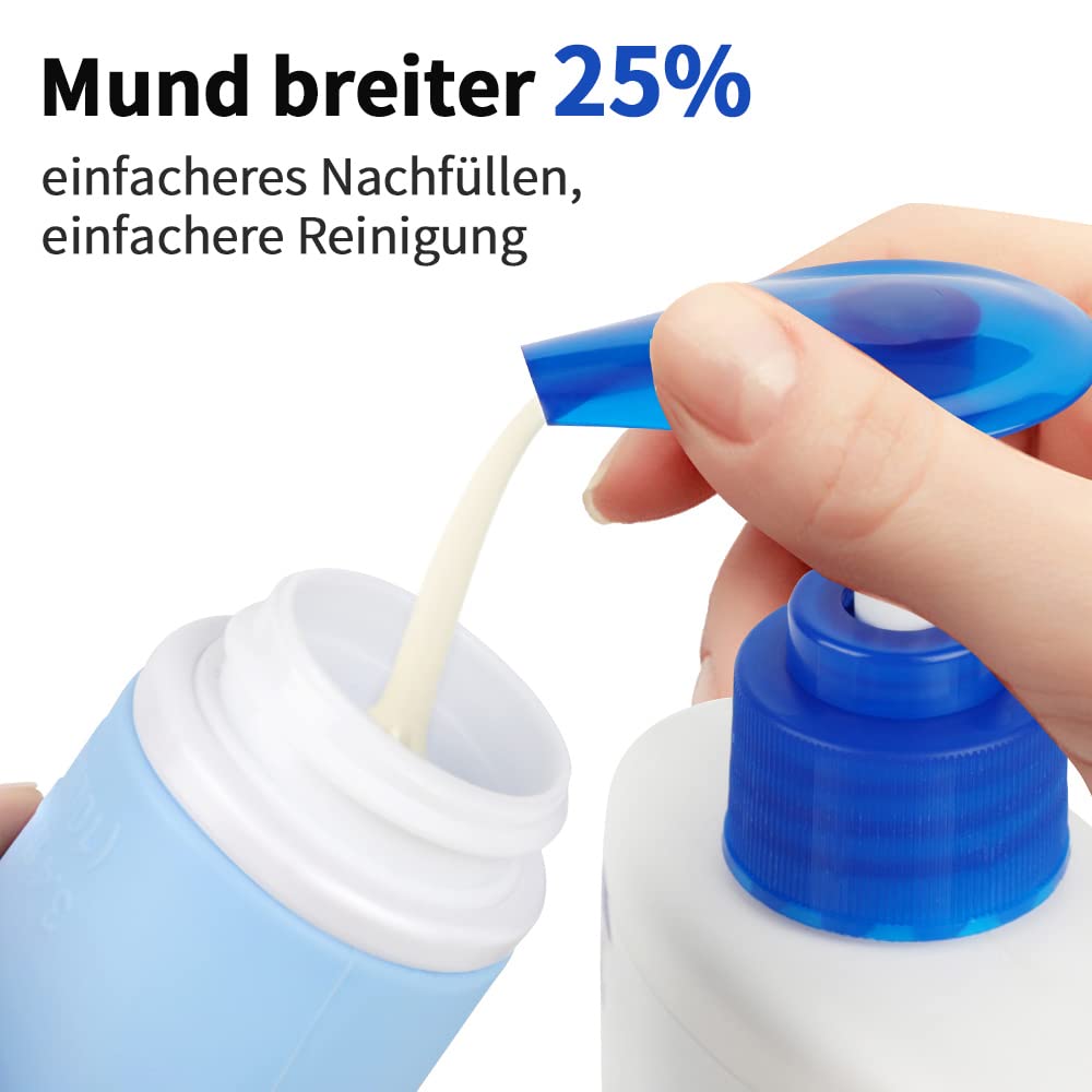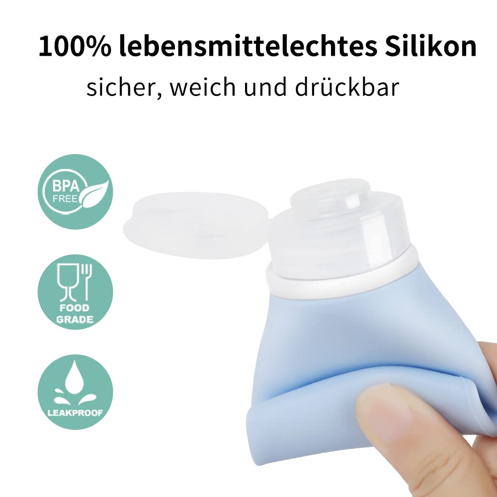 Die Reiseflaschen bestehen aus weichem, flexiblem Silikon, das ein einfaches Befuellen und muheloses Dosieren ermoeglicht. Auch dickfluessige Produkte lassen sich durch leichtes Druecken problemlos entnehmen, ohne dass Rueckstaende im Inneren verbleiben. Die breite Oeffnung erleichtert zudem das saubere Nachfuellen und die gruendliche Reinigung.