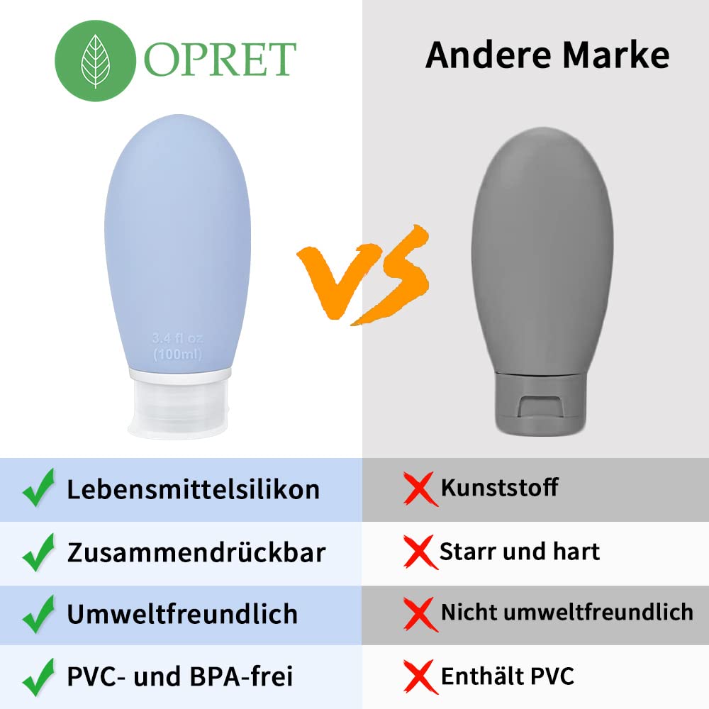 Das Opret Silikon Reiseflaschen Set ist die perfekte Wahl fuer alle, die ihre Pflegeprodukte sicher, hygienisch und komfortabel auf Reisen transportieren moechten.