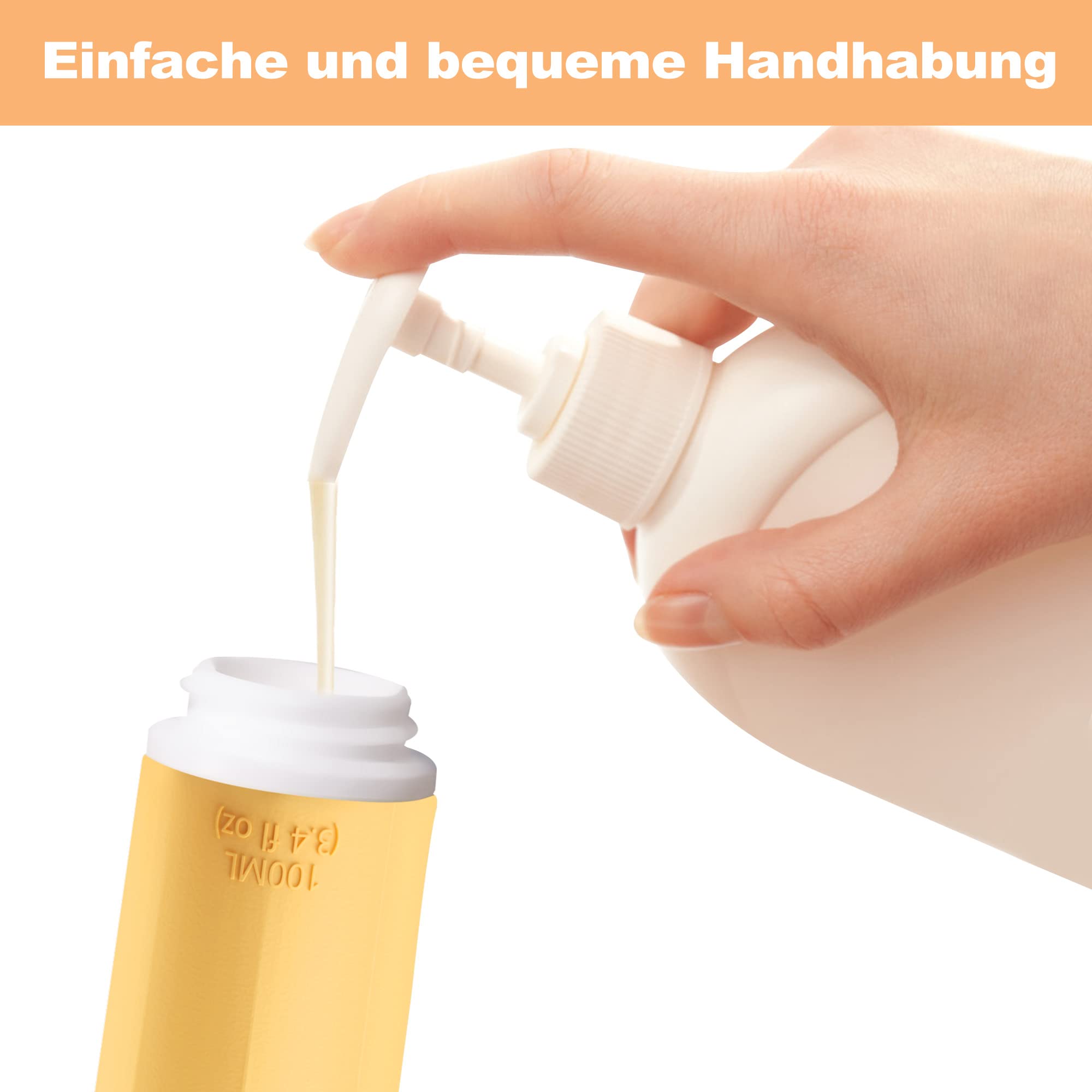 Mit einem Fassungsvermoegen von 100 ml pro Flasche entsprechen die Reiseflaschen den gaengigen Reisegroessen und sind ideal fuer Flugreisen sowie andere Reisearten. Die Flaschen sind leicht, platzsparend und wiederverwendbar, was sie zu einer umweltfreundlichen Alternative zu Einwegbehaeltern macht.